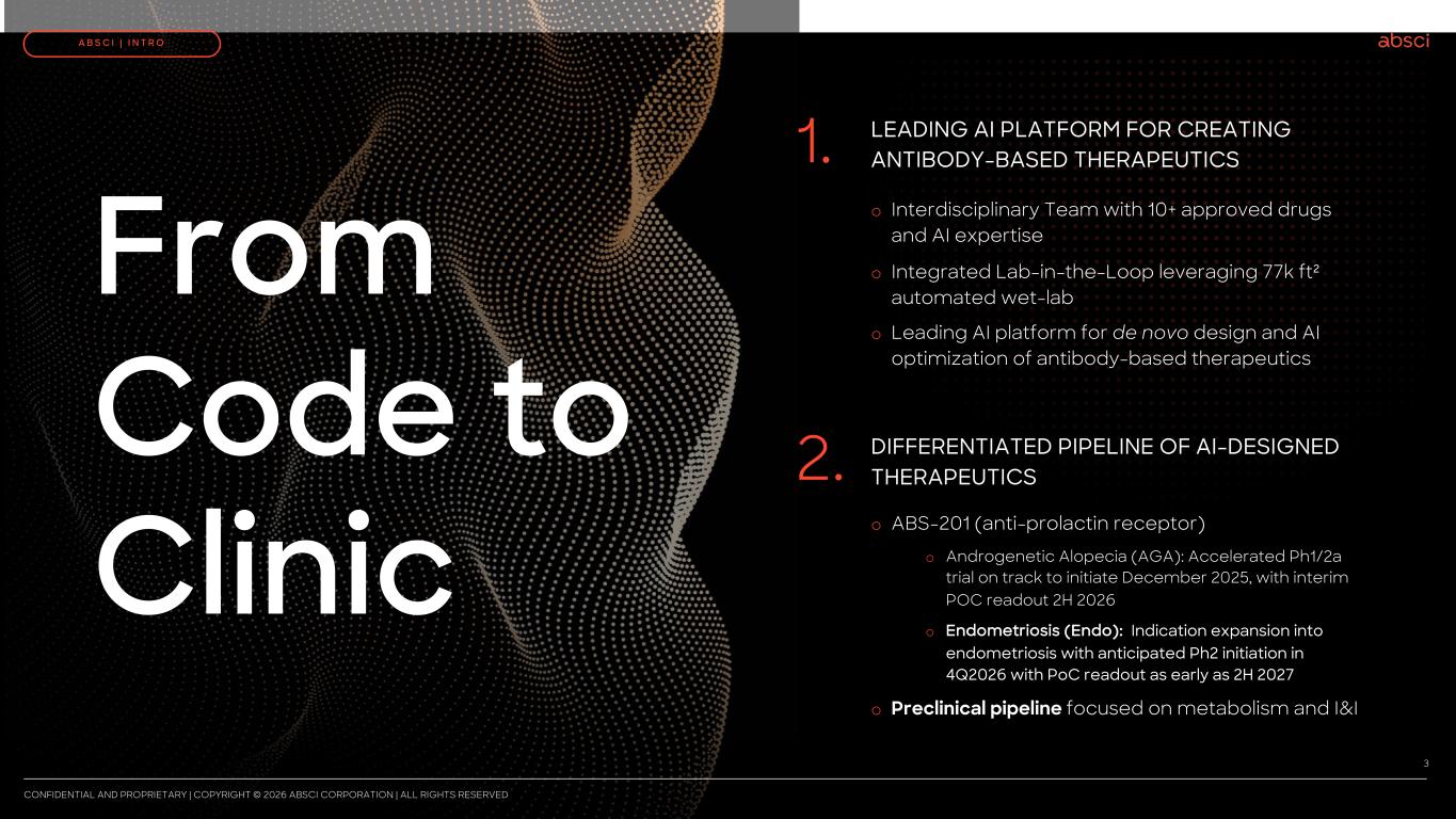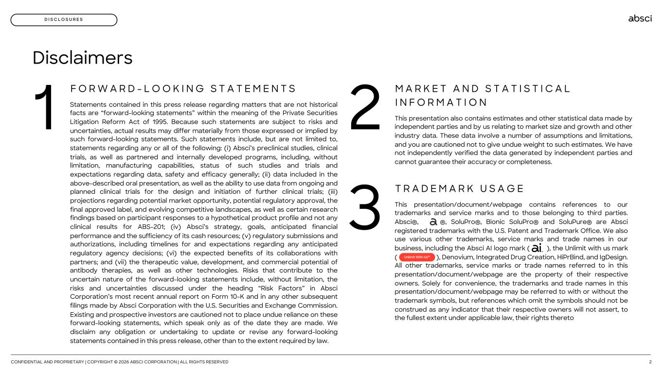 Disclaimers F O R W A R D - L O O K I N G S T A T E M E N T S Statements contained in this press release regarding matters that are not historical facts are “forward-looking statements” within the meaning of the Private Securities Litigation Reform Act of 1995. Because such statements are subject to risks and uncertainties, actual results may differ materially from those expressed or implied by such forward-looking statements. Such statements include, but are not limited to, statements regarding any or all of the following: (i) Absci’s preclinical studies, clinical trials, as well as partnered and internally developed programs, including, without limitation, manufacturing capabilities, status of such studies and trials and expectations regarding data, safety and efficacy generally; (ii) data included in the above-described oral presentation, as well as the ability to use data from ongoing and planned clinical trials for the design and initiation of further clinical trials; (iii) projections regarding potential market opportunity, potential regulatory approval, the final approved label, and evolving competitive landscapes, as well as certain research findings based on participant responses to a hypothetical product profile and not any clinical results for ABS-201; (iv) Absci’s strategy, goals, anticipated financial performance and the sufficiency of its cash resources; (v) regulatory submissions and authorizations, including timelines for and expectations regarding any anticipated regulatory agency decisions; (vi) the expected benefits of its collaborations with partners; and (vii) the therapeutic value, development, and commercial potential of antibody therapies, as well as other technologies. Risks that contribute to the uncertain nature of the forward-looking statements include, without limitation, the risks and uncertainties discussed under the heading “Risk Factors” in Absci Corporation’s most recent annual report on Form 10-K and in any other subsequent filings made by Absci Corporation with the U.S. Securities and Exchange Commission. Existing and prospective investors are cautioned not to place undue reliance on these forward-looking statements, which speak only as of the date they are made. We disclaim any obligation or undertaking to update or revise any forward-looking statements contained in this press release, other than to the extent required by law. 1 M A R K E T A N D S T A T I S T I C A L I N F O R M A T I O N This presentation also contains estimates and other statistical data made by independent parties and by us relating to market size and growth and other industry data. These data involve a number of assumptions and limitations, and you are cautioned not to give undue weight to such estimates. We have not independently verified the data generated by independent parties and cannot guarantee their accuracy or completeness. 2 T R A D E M A R K U S A G E This presentation/document/webpage contains references to our trademarks and service marks and to those belonging to third parties. Absci®, ®, SoluPro®, Bionic SoluPro® and SoluPure® are Absci registered trademarks with the U.S. Patent and Trademark Office. We also use various other trademarks, service marks and trade names in our business, including the Absci AI logo mark ( ), the Unlimit with us mark ( ), Denovium, Integrated Drug Creation, HiPrBind, and IgDesign. All other trademarks, service marks or trade names referred to in this presentation/document/webpage are the property of their respective owners. Solely for convenience, the trademarks and trade names in this presentation/document/webpage may be referred to with or without the trademark symbols, but references which omit the symbols should not be construed as any indicator that their respective owners will not assert, to the fullest extent under applicable law, their rights thereto 3 CONFIDENTIAL AND PROPRIETARY | COPYRIGHT © 2026 ABSCI CORPORATION | ALL RIGHTS RESERVED 2 D I S C L O S U R E S