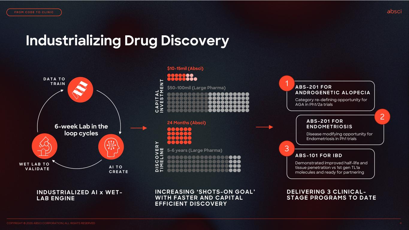 LEADING AI PLATFORM FOR CREATING ANTIBODY-BASED THERAPEUTICS 1. DIFFERENTIATED PIPELINE OF AI-DESIGNED THERAPEUTICS2. From Code to Clinic CONFIDENTIAL AND PROPRIETARY | COPYRIGHT © 2026 ABSCI CORPORATION | ALL RIGHTS RESERVED 3 A B S C I | I N T R O o Interdisciplinary Team with 10+ approved drugs and AI expertise o Integrated Lab-in-the-Loop leveraging 77k ft² automated wet-lab o Leading AI platform for de novo design and AI optimization of antibody-based therapeutics o ABS-201 (anti-prolactin receptor) o Androgenetic Alopecia (AGA): Accelerated Ph1/2a trial on track to initiate December 2025, with interim POC readout 2H 2026 o Endometriosis (Endo): Indication expansion into endometriosis with anticipated Ph2 initiation in 4Q2026 with PoC readout as early as 2H 2027 o Preclinical pipeline focused on metabolism and I&I