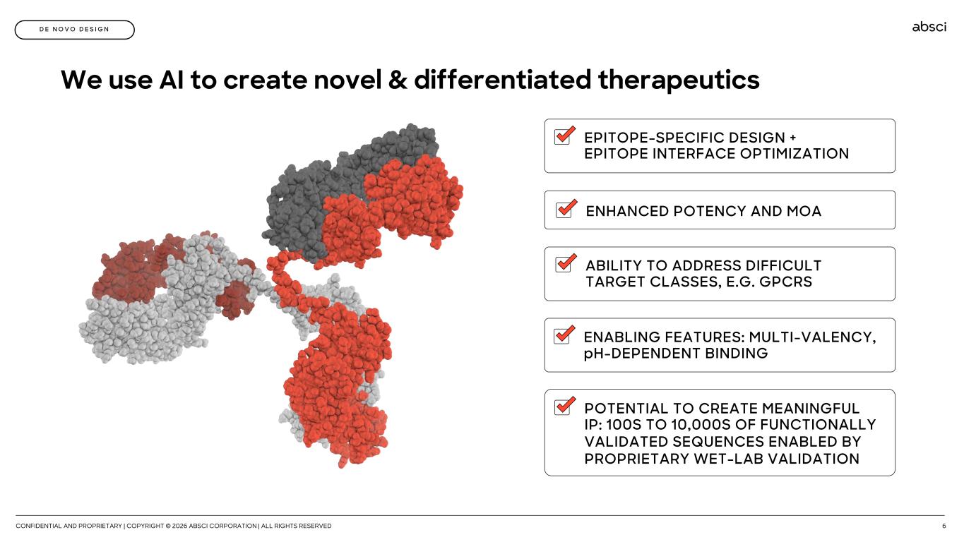 CONFIDENTIAL AND PROPRIETARY | COPYRIGHT © 2026 ABSCI CORPORATION | ALL RIGHTS RESERVED 5 D E N O V O D E S I G N Leadership in AI de novo design of antibody-based therapeutics De Novo Antibody DesignAI Lead Optimization De novo antibody design model creates epitope-specific binders given a target structure Designed in framework of choice or multiple frameworks INPUT EMBEDDING STRUCTURE DESIGN (DIFFUSION) . . . ARCPSIWKFPDEEGACQPC . . . Antigen Structure/Sequence (Epitope) EVQLSEVGA . . . PROTEIN LANGUAGE MODELS Co-optimization enables improvement of antibody attributes such as affinity and developability Precise engineering of molecule pharmacology