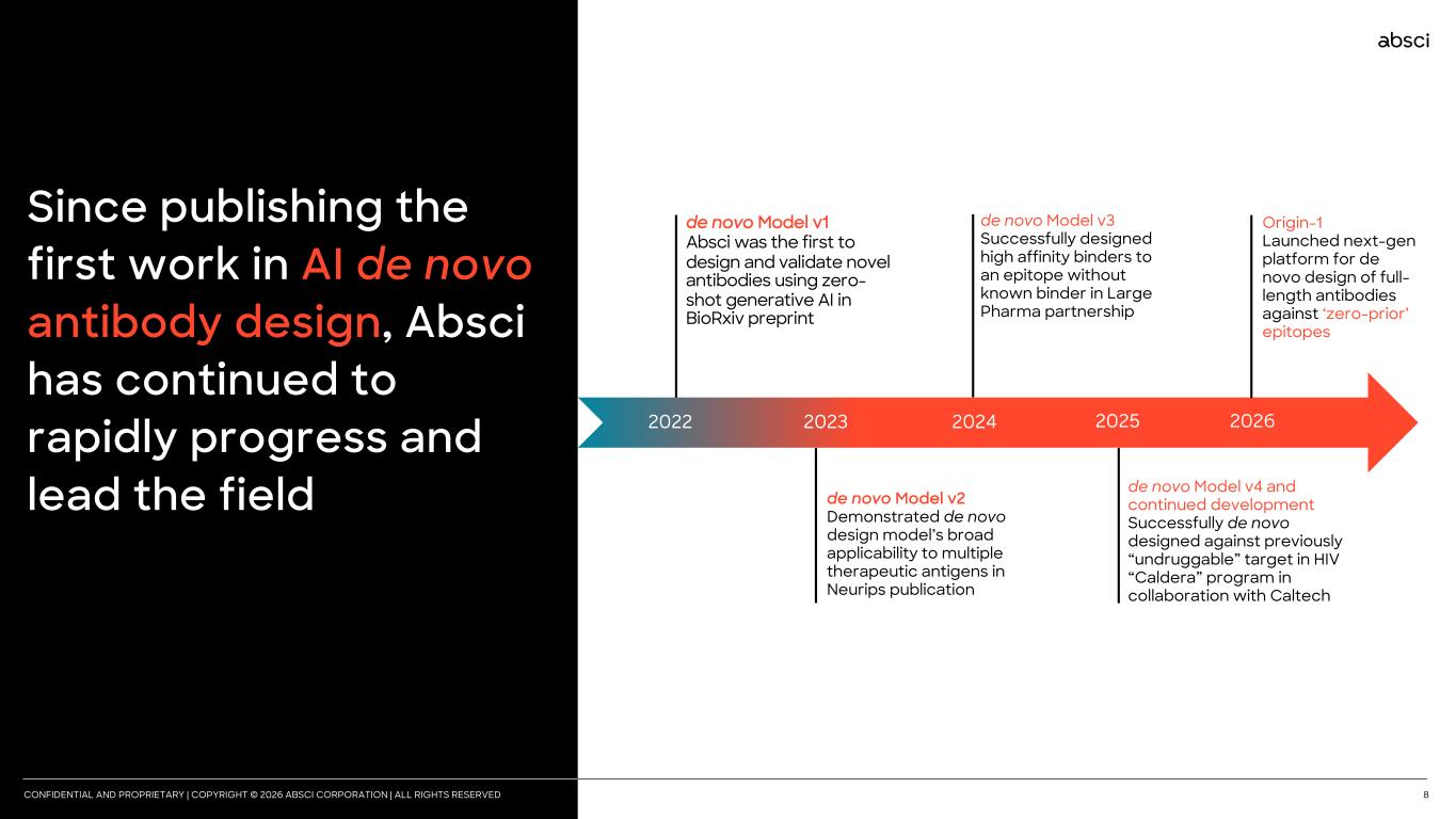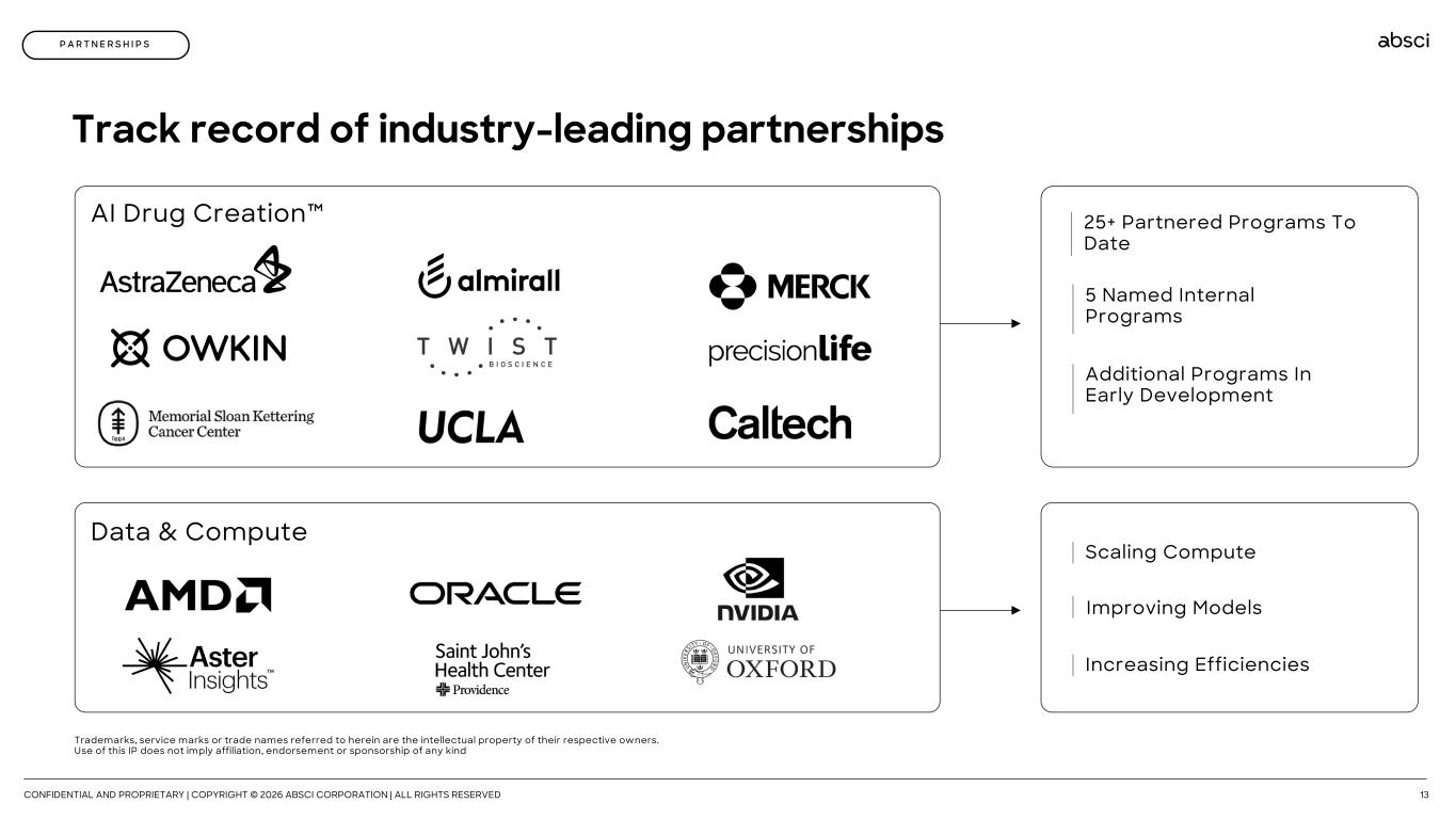 •Drug Creation Partnerships: Absci continues to make further progress on its existing drug creation partnerships and anticipates signing one or more partnerships, including with a Large Pharma company, in 2026.