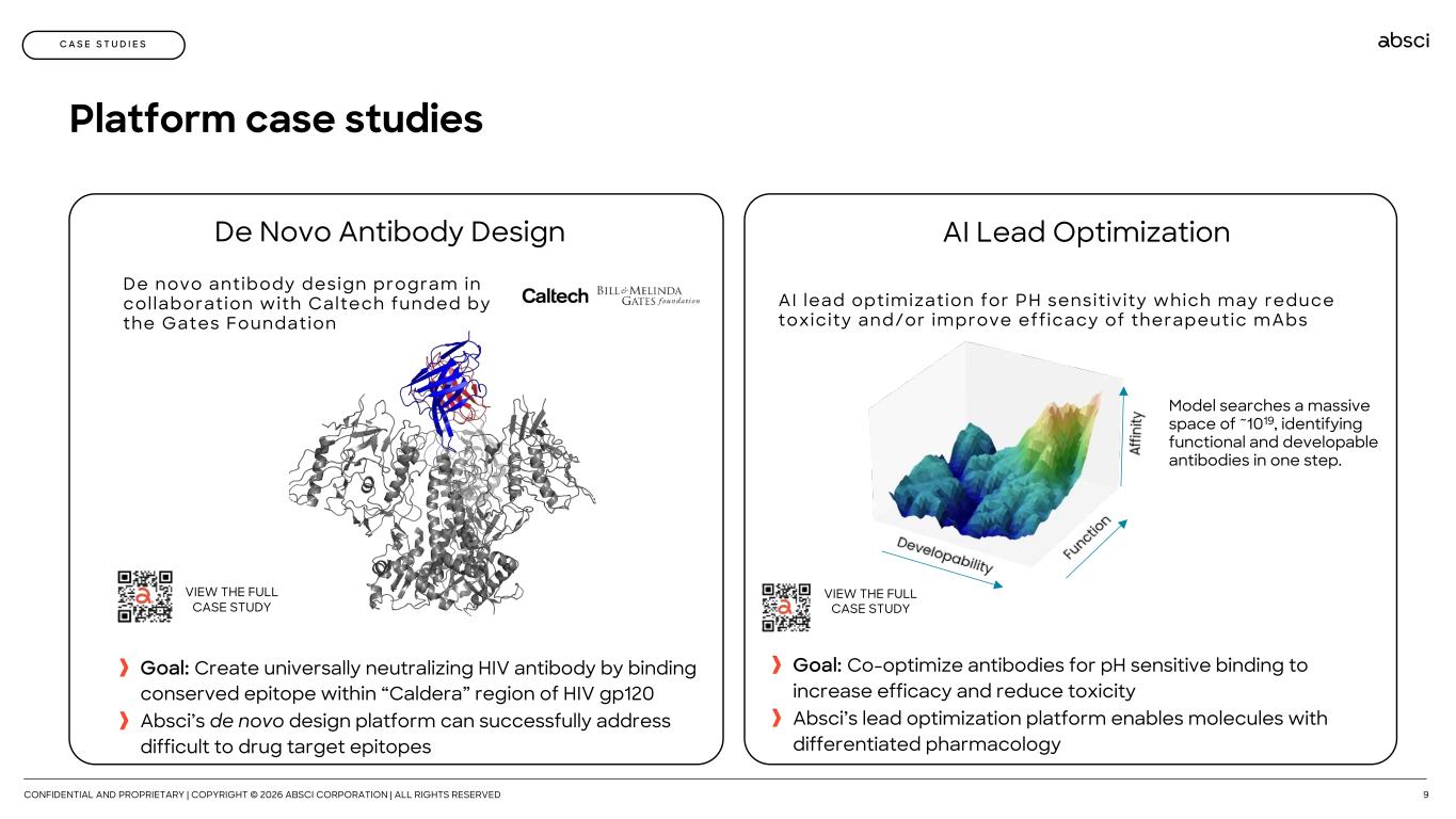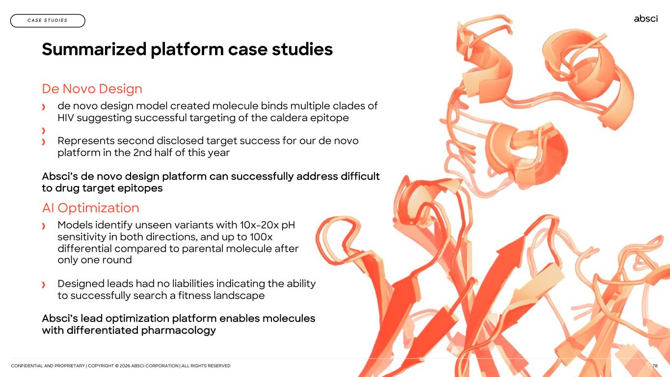 CONFIDENTIAL AND PROPRIETARY | COPYRIGHT © 2026 ABSCI CORPORATION | ALL RIGHTS RESERVED 9 C A S E S T U D I E S Platform case studies AI Lead Optimization De Novo Antibody Design Goal: Create universally neutralizing HIV antibody by binding conserved epitope within “Caldera” region of HIV gp120 Absci’s de novo design platform can successfully address difficult to drug target epitopes VIEW THE FULL CASE STUDY De novo antibody design program in collaboration with Caltech funded by the Gates Foundation AI lead optimization for PH sensitivity which may reduce toxicity and/or improve efficacy of therapeutic mAbs VIEW THE FULL CASE STUDY Goal: Co-optimize antibodies for pH sensitive binding to increase efficacy and reduce toxicity Absci’s lead optimization platform enables molecules with differentiated pharmacology Model searches a massive space of ~1019, identifying functional and developable antibodies in one step.