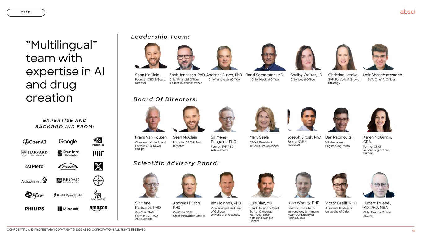 ”Multilingual” team with expertise in AI and drug creation CONFIDENTIAL AND PROPRIETARY | COPYRIGHT © 2026 ABSCI CORPORATION | ALL RIGHTS RESERVED 10 T E A M Sean McClain Founder, CEO & Board Director Zach Jonasson, PhD Chief Financial Officer & Chief Business Officer Amir Shanehsazzadeh SVP, Chief AI Officer Shelby Walker, JD Chief Legal Officer Christine Lemke SVP, Portfolio & Growth Strategy L e a d e r s h i p T e a m : Sean McClain Founder, CEO & Board Director Sir Mene Pangalos, PhD Former EVP R&D AstraZeneca Mary Szela CEO & President TriSalus Life Sciences Joseph Sirosh, PhD Former CVP AI Microsoft Dan Rabinovitsj VP Hardware Engineering, Meta Karen McGinnis, CPA Former Chief Accounting Officer, Illumina Frans Van Houten Chairman of the Board Former CEO, Royal Phillips B o a r d O f D i r e c t o r s : Andreas Busch, PHD Co-Chair SAB Chief Innovation Officer Ian McInnes, PHD Vice Principal and Head of College University of Glasgow Luis Diaz, MD Head, Division of Solid Tumor Oncology Memorial Sloan Kettering Cancer Center John Wherry, PHD Director, Institute for Immunology & Immune Health, University of Pennsylvania Victor Greiff, PHD Associate Professor University of Oslo Hubert Truebel, MD, PHD, MBA Chief Medical Officer AiCuris Sir Mene Pangalos, PHD Co-Chair SAB Former EVP R&D AstraZeneca S c i e n t i f i c A d v i s o r y B o a r d : Ransi Somaratne, MD Chief Medical Officer E X P E R T I S E A N D B A C K G R O U N D F R O M : Andreas Busch, PhD Chief Innovation Officer