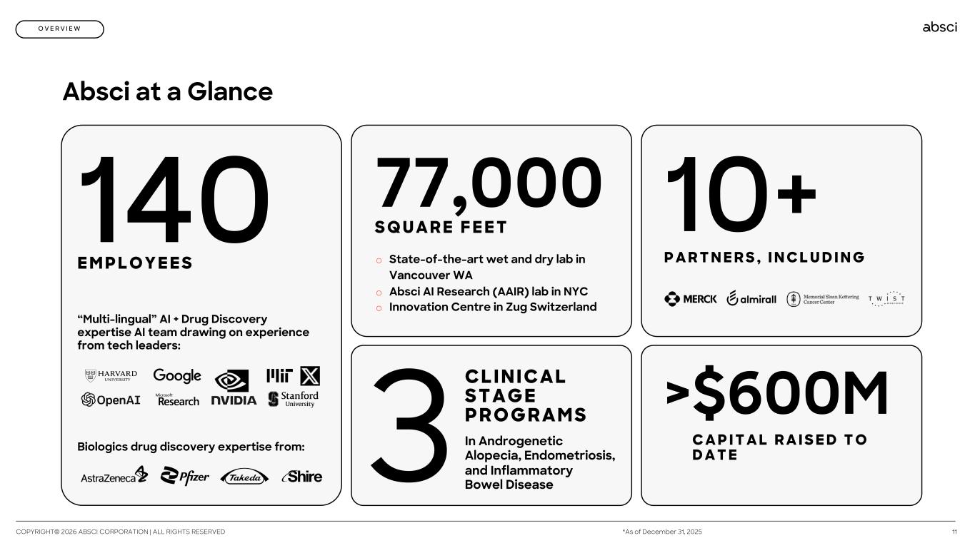 11 140 E M P L O Y E E S Biologics drug discovery expertise from: “Multi-lingual” AI + Drug Discovery expertise AI team drawing on experience from tech leaders: 77,000 S Q U A R E F E E T o State-of-the-art wet and dry lab in Vancouver WA o Absci AI Research (AAIR) lab in NYC o Innovation Centre in Zug Switzerland 3 CLI NI CAL STAGE PR O GR AMS In Androgenetic Alopecia, Endometriosis, and Inflammatory Bowel Disease >$600M C A P I T A L R A I S E D T O D A T E 10+ P A R T N E R S , I N C L U D I N G Absci at a Glance O V E R V I E W COPYRIGHT© 2026 ABSCI CORPORATION | ALL RIGHTS RESERVED *As of December 31, 2025