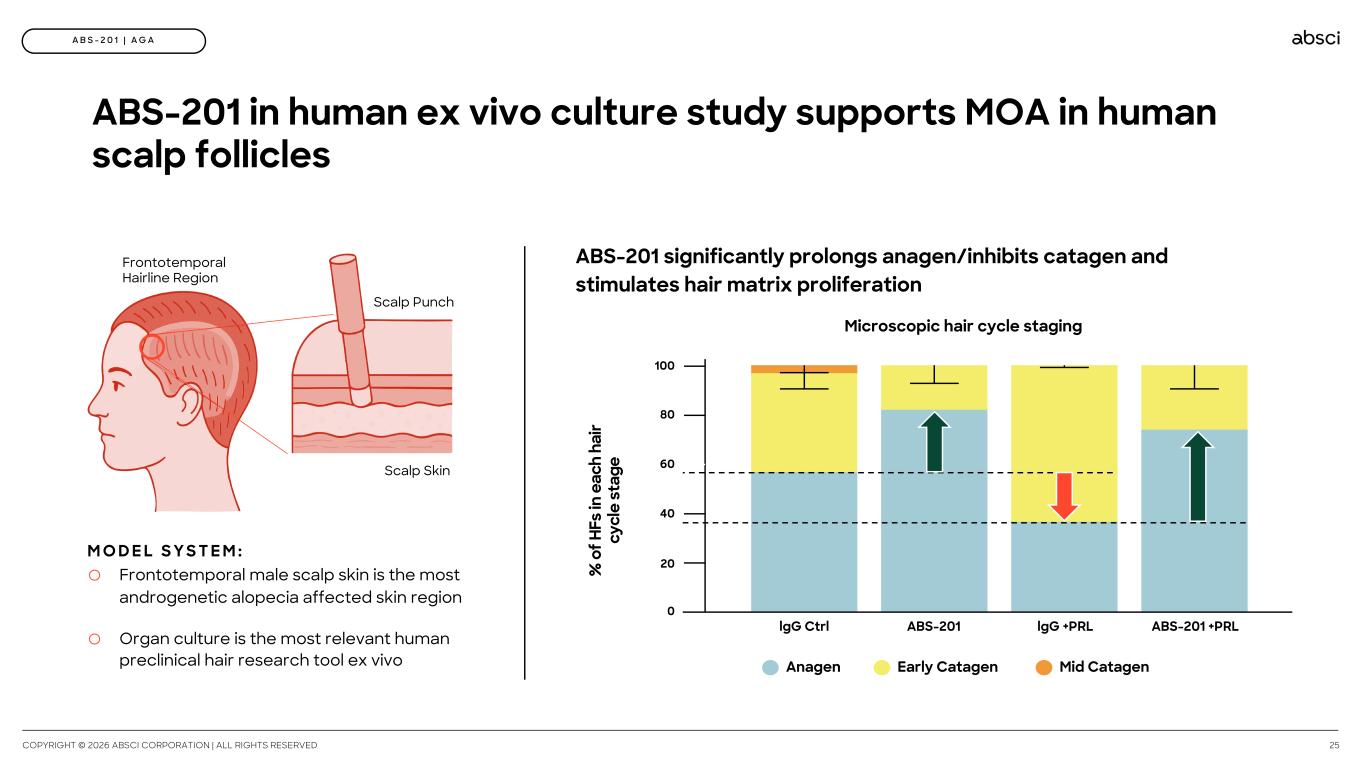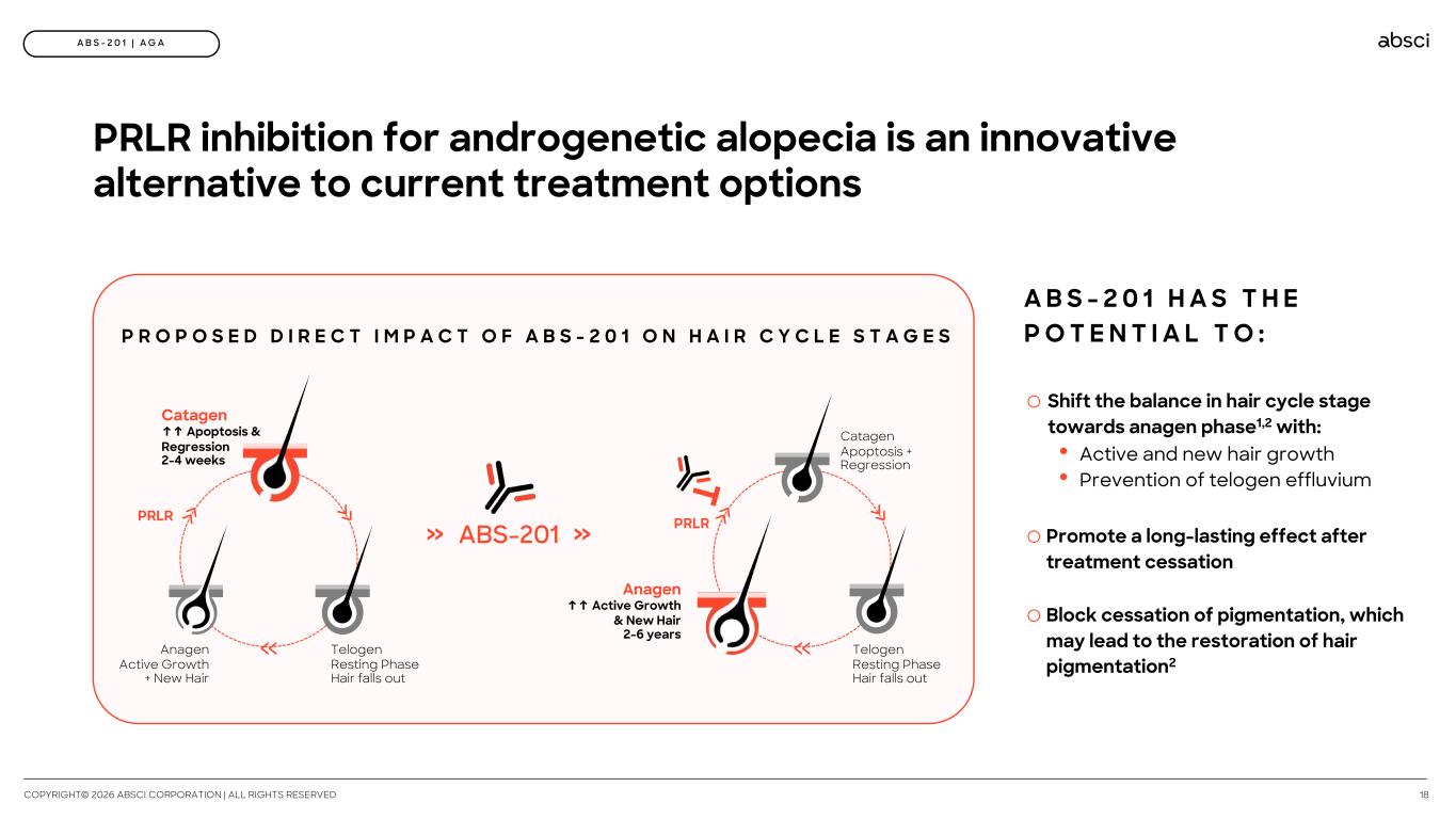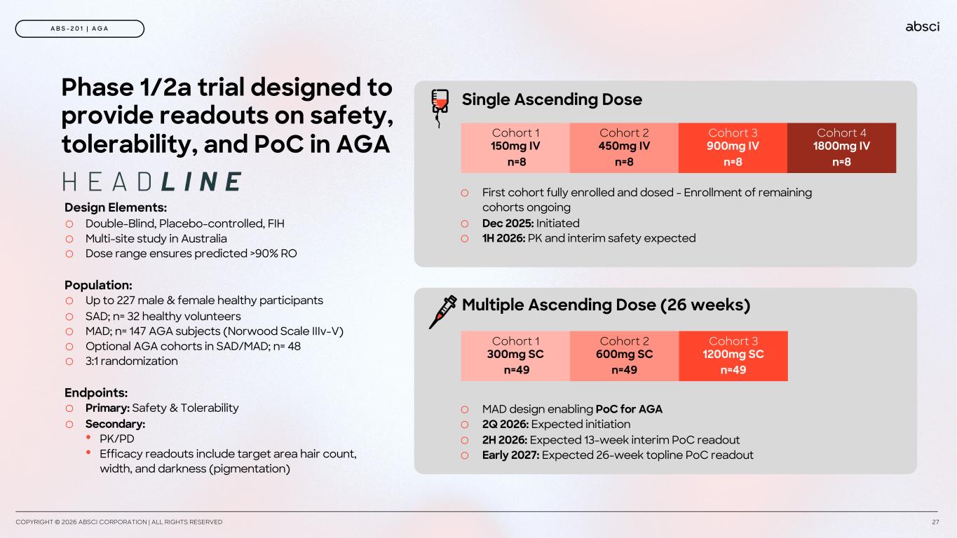 •ABS-201 (anti-PRLR antibody) for androgenetic alopecia: ABS-201 is an anti-PRLR antibody, currently undergoing Phase 1/2a studies, in development for androgenetic alopecia (AGA), commonly known as male and female pattern hair loss. Absci believes that ABS-201, if successfully developed and approved, could provide a significant new category of AGA treatment that offers potentially durable hair growth with a convenient administration profile. Today, Absci announced that it has successfully dosed the first three cohorts in the SAD portion of its ongoing Phase 1/2a HEADLINE trial. ABS-201 has been well tolerated to date, with favorable emerging safety data. Absci anticipates reporting preliminary safety, tolerability, and pharmacokinetic (PK) data in the first half of 2026, with interim proof-of-concept data in the second half of 2026 and full proof-of-concept data in early 2027.