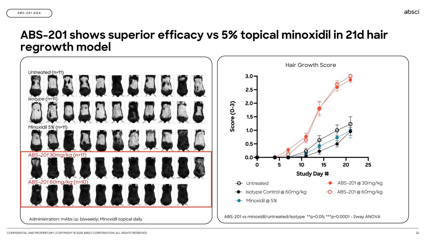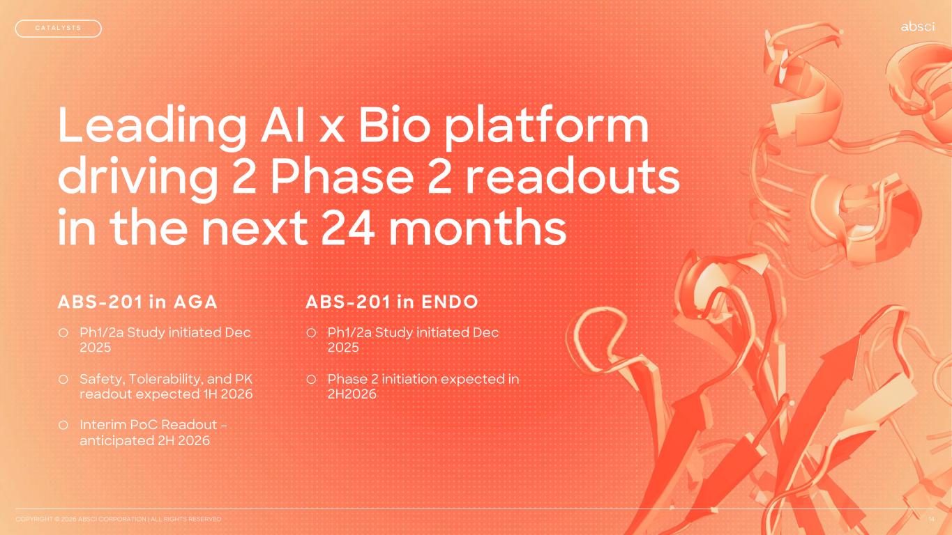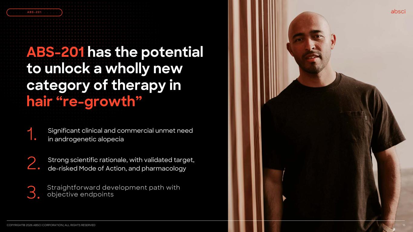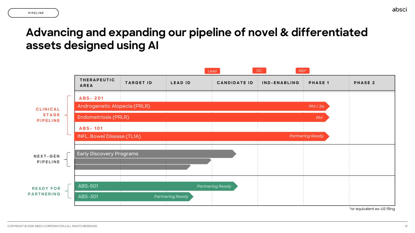 •ABS-201 (anti-PRLR antibody) for androgenetic alopecia: ABS-201 is an anti-PRLR antibody, currently undergoing Phase 1/2a studies, in development for androgenetic alopecia (AGA), commonly known as male and female pattern hair loss. Absci believes that ABS-201, if successfully developed and approved, could provide a significant new category of AGA treatment that offers potentially durable hair growth with a convenient administration profile. Today, Absci announced that it has successfully dosed the first three cohorts in the SAD portion of its ongoing Phase 1/2a HEADLINE trial. ABS-201 has been well tolerated to date, with favorable emerging safety data. Absci anticipates reporting preliminary safety, tolerability, and pharmacokinetic (PK) data in the first half of 2026, with interim proof-of-concept data in the second half of 2026 and full proof-of-concept data in early 2027.