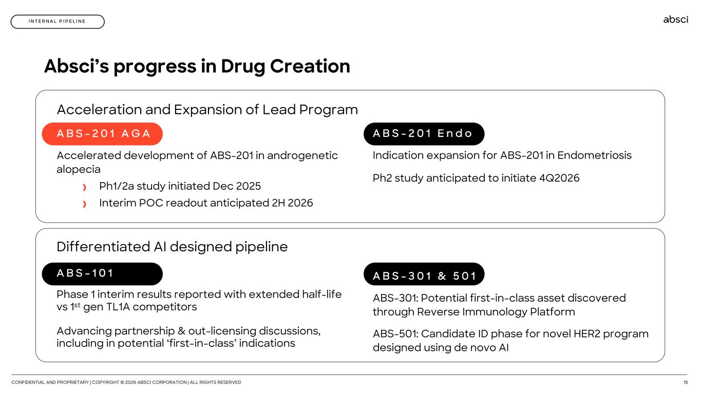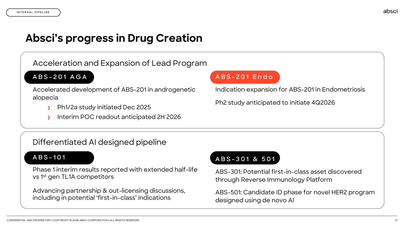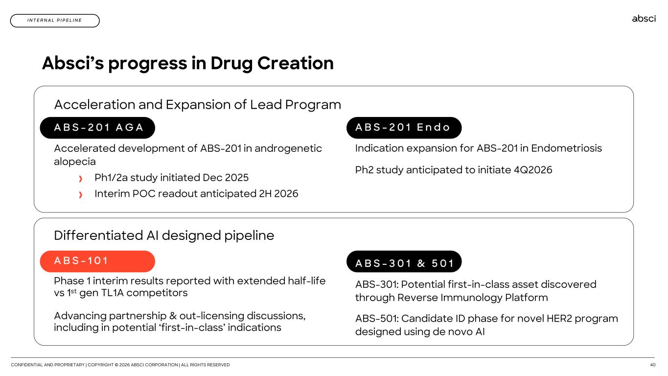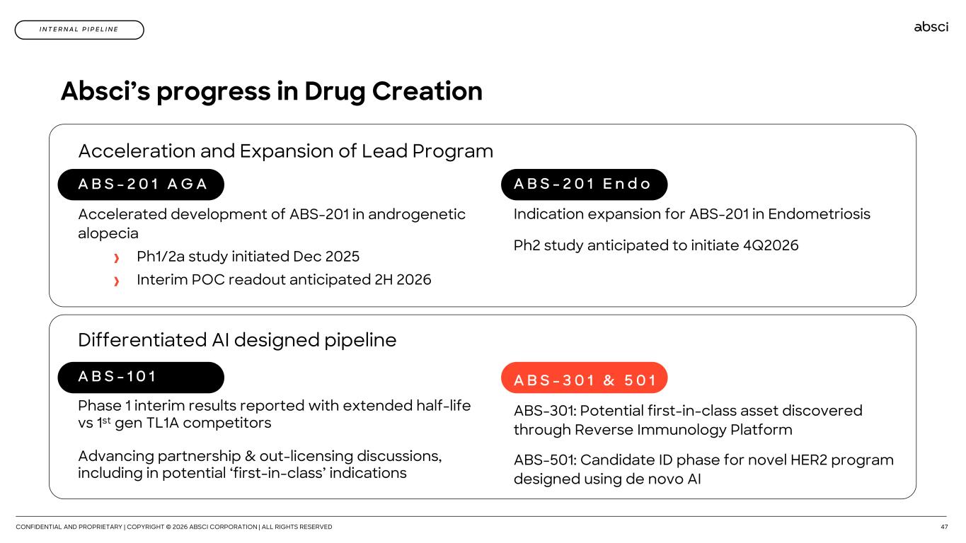 CONFIDENTIAL AND PROPRIETARY | COPYRIGHT © 2026 ABSCI CORPORATION | ALL RIGHTS RESERVED 47 I N T E R N A L P I P E L I N E Absci’s progress in Drug Creation A B S - 2 0 1 A G A Accelerated development of ABS-201 in androgenetic alopecia Ph1/2a study initiated Dec 2025 Interim POC readout anticipated 2H 2026 A B S - 2 0 1 E n d o Indication expansion for ABS-201 in Endometriosis Ph2 study anticipated to initiate 4Q2026 A B S - 1 0 1 Phase 1 interim results reported with extended half-life vs 1st gen TL1A competitors Advancing partnership & out-licensing discussions, including in potential ‘first-in-class’ indications A B S - 3 0 1 & 5 0 1 ABS-301: Potential first-in-class asset discovered through Reverse Immunology Platform ABS-501: Candidate ID phase for novel HER2 program designed using de novo AI Acceleration and Expansion of Lead Program Differentiated AI designed pipeline