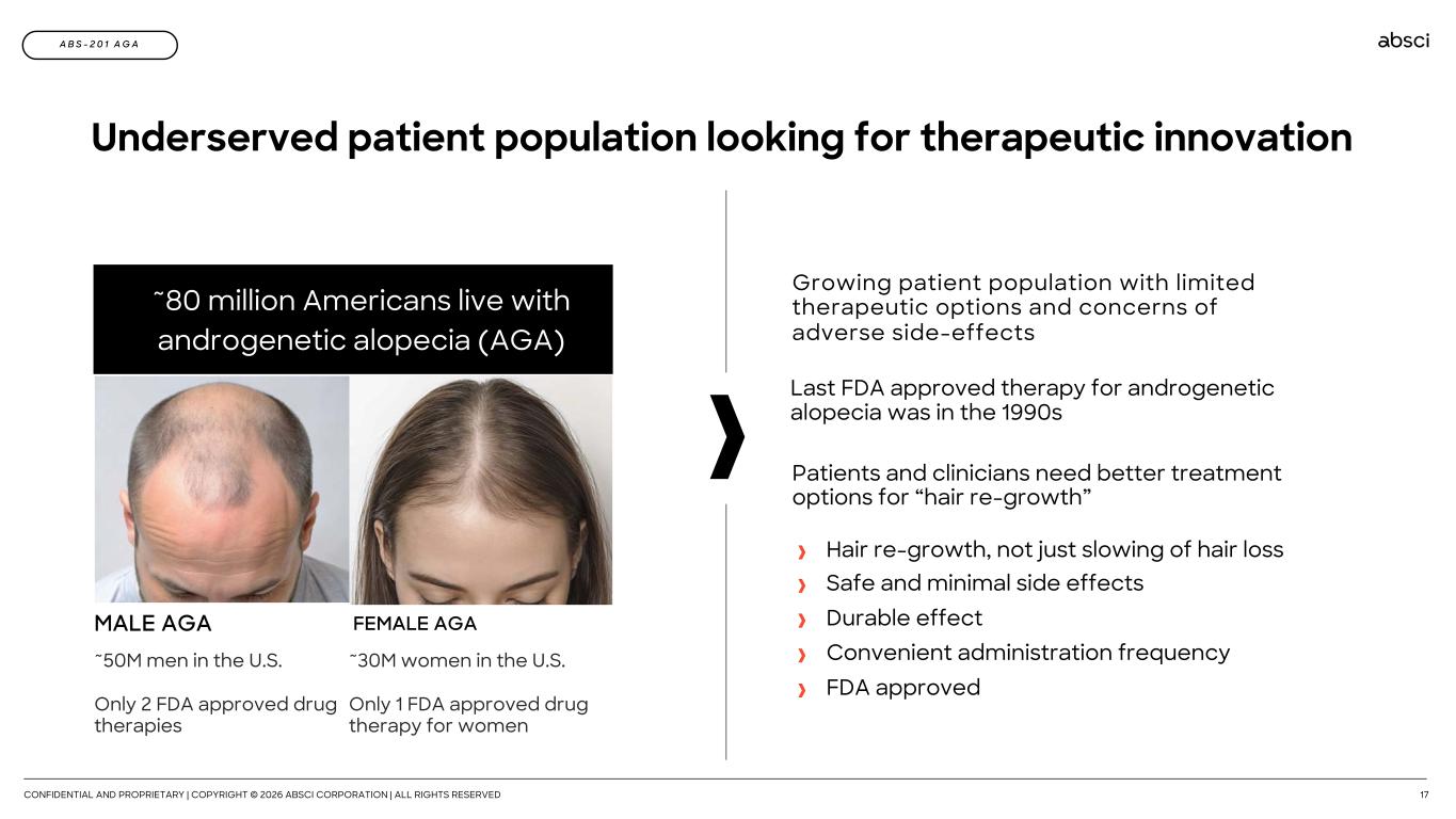 ABS-201 has the potential to unlock a wholly new category of therapy in hair “re-growth” Significant clinical and commercial unmet need in androgenetic alopecia1. Strong scientific rationale, with validated target, de-risked Mode of Action, and pharmacology2. 3. COPYRIGHT© 2026 ABSCI CORPORATION | ALL RIGHTS RESERVED 16 A B S - 2 0 1 Straightforward development path with objective endpoints