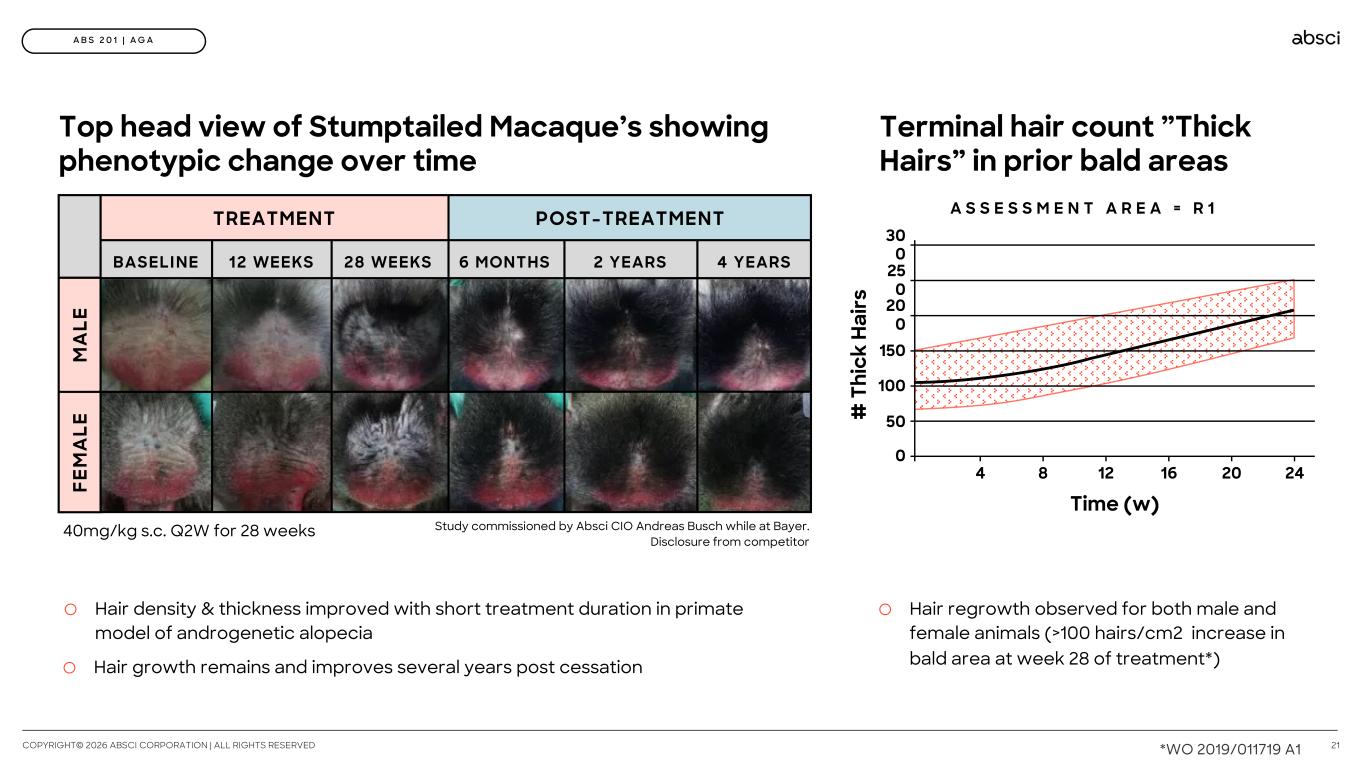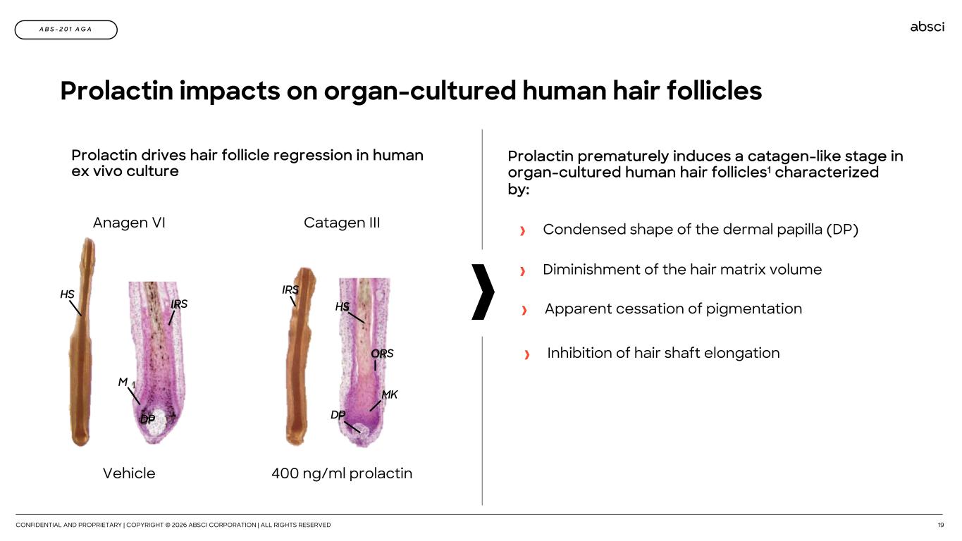 18 A B S - 2 0 1 | A G A PRLR inhibition for androgenetic alopecia is an innovative alternative to current treatment options P R O P O S E D D I R E C T I M P A C T O F A B S - 2 0 1 O N H A I R C Y C L E S T A G E S Telogen Resting Phase Hair falls out Catagen ↑↑ Apoptosis & Regression 2-4 weeks Anagen Active Growth + New Hair » »»PRLR ABS-201 »» Anagen ↑↑ Active Growth & New Hair 2-6 years Catagen Apoptosis + Regression Telogen Resting Phase Hair falls out »» » PRLR o Shift the balance in hair cycle stage towards anagen phase1,2 with: • Active and new hair growth • Prevention of telogen effluvium o Promote a long-lasting effect after treatment cessation o Block cessation of pigmentation, which may lead to the restoration of hair pigmentation2 A B S - 2 0 1 H A S T H E P O T E N T I A L T O : COPYRIGHT© 2026 ABSCI CORPORATION | ALL RIGHTS RESERVED