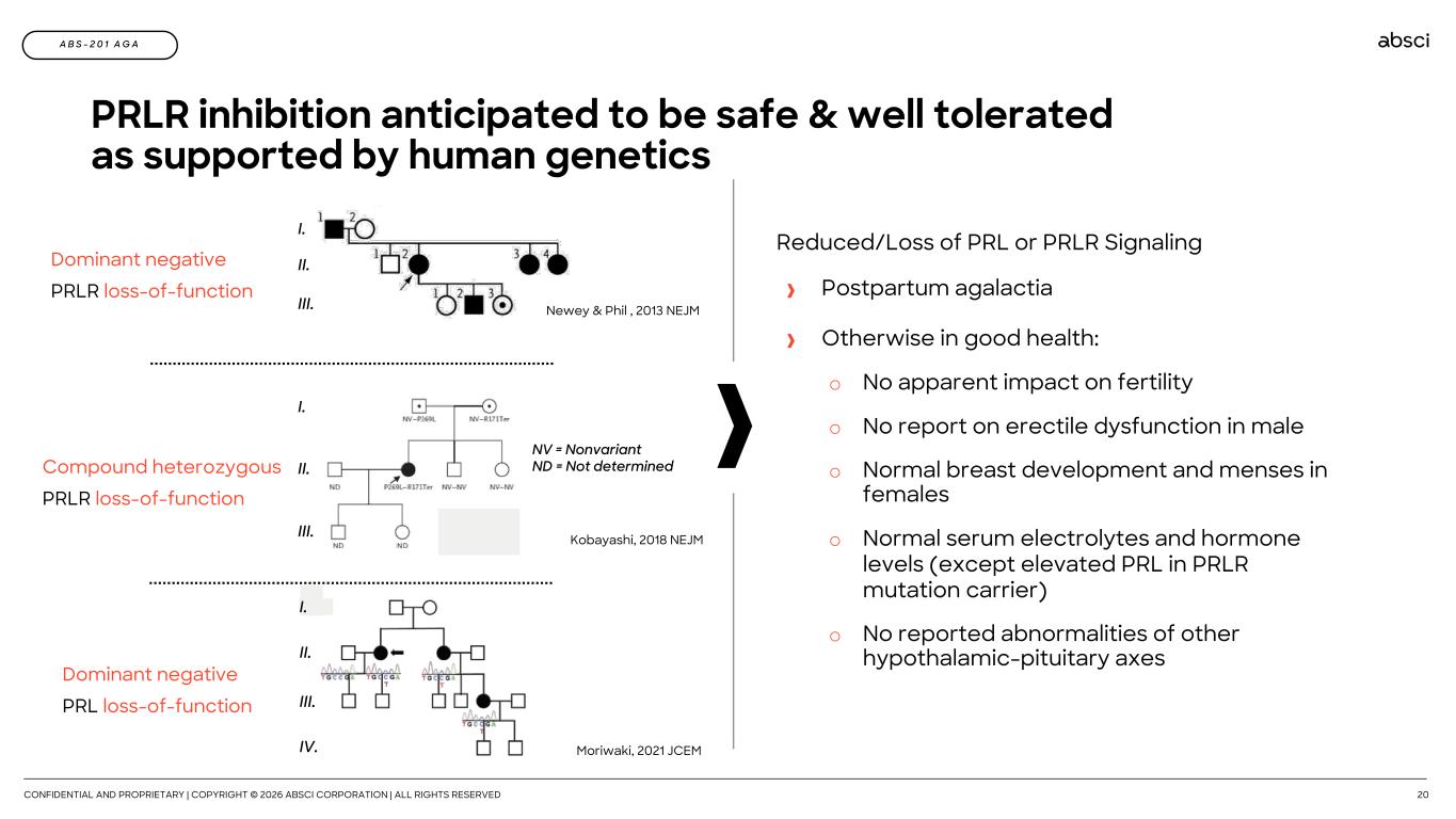 CONFIDENTIAL AND PROPRIETARY | COPYRIGHT © 2026 ABSCI CORPORATION | ALL RIGHTS RESERVED 20 A B S - 2 0 1 A G A PRLR inhibition anticipated to be safe & well tolerated as supported by human genetics I. II. III. NV = Nonvariant ND = Not determined I. II. III. I. II. III. IV. Kobayashi, 2018 NEJM Moriwaki, 2021 JCEM Newey & Phil , 2013 NEJM Compound heterozygous PRLR loss-of-function Dominant negative PRL loss-of-function Dominant negative PRLR loss-of-function Reduced/Loss of PRL or PRLR Signaling Postpartum agalactia Otherwise in good health: o No apparent impact on fertility o No report on erectile dysfunction in male o Normal breast development and menses in females o Normal serum electrolytes and hormone levels (except elevated PRL in PRLR mutation carrier) o No reported abnormalities of other hypothalamic-pituitary axes