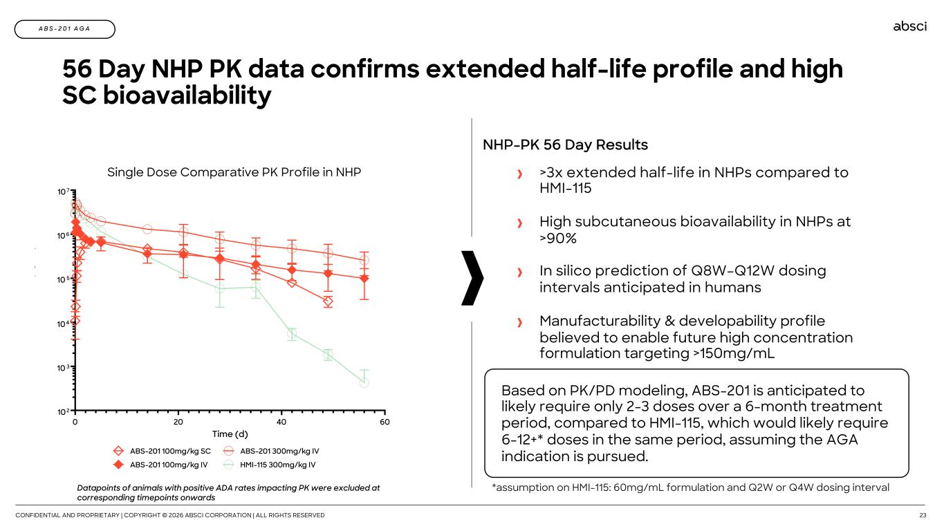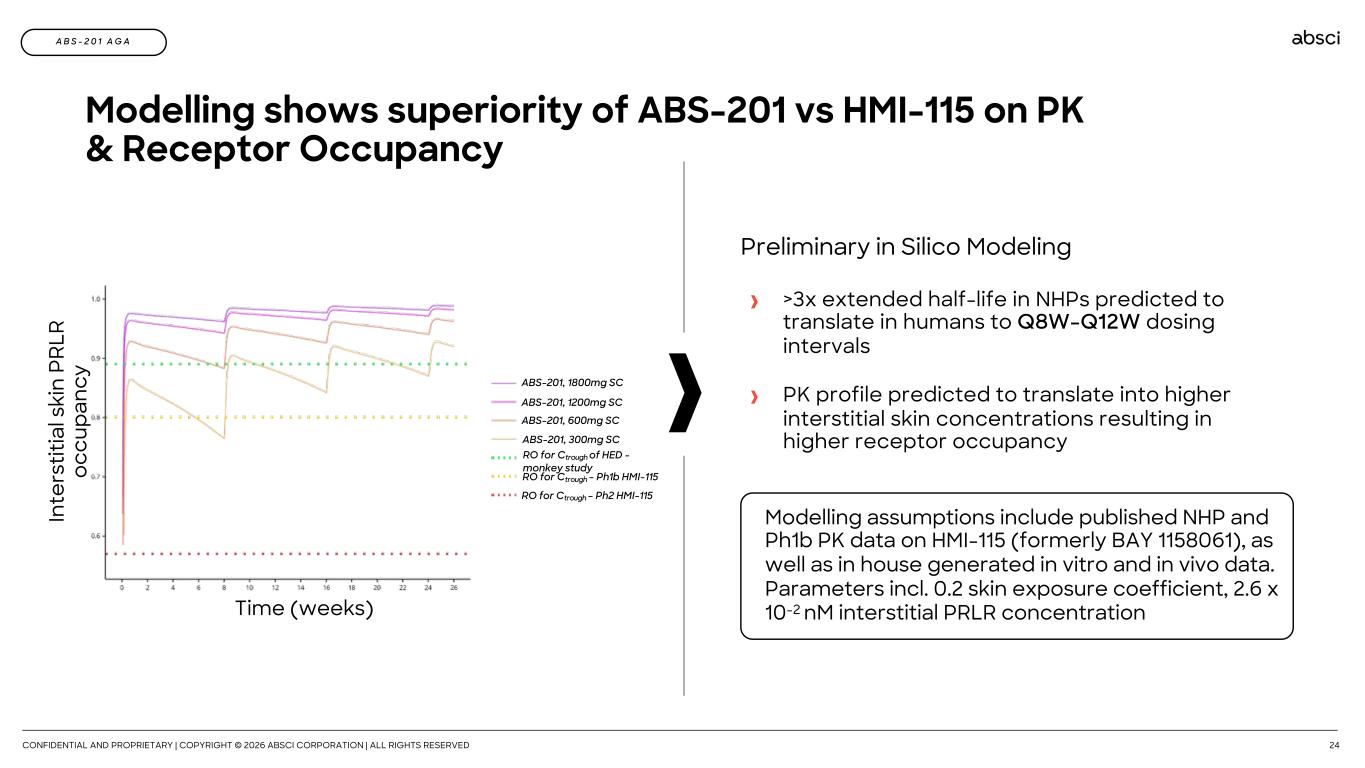 CONFIDENTIAL AND PROPRIETARY | COPYRIGHT © 2026 ABSCI CORPORATION | ALL RIGHTS RESERVED 23 A B S - 2 0 1 A G A 56 Day NHP PK data confirms extended half-life profile and high SC bioavailability 0 20 40 60 102 10 3 104 10 5 106 107 Single Dose Comparative PK Profile in NHPs Time (d) m A b se ru m c on c (n g/ m l) ABS-201 100mg/kg SC ABS-201 100mg/kg IV ABS-201 300mg/kg IV HMI-115 300mg/kg IV Datapoints of animals with positive ADA rates impacting PK were excluded at corresponding timepoints onwards i l s o parative PK Profile in NHP >3x extended half-life in NHPs compared to HMI-115 High subcutaneous bioavailability in NHPs at >90% In silico prediction of Q8W–Q12W dosing intervals anticipated in humans Manufacturability & developability profile believed to enable future high concentration formulation targeting >150mg/mL NHP-PK 56 Day Results Based on PK/PD modeling, ABS-201 is anticipated to likely require only 2-3 doses over a 6-month treatment period, compared to HMI-115, which would likely require 6-12+* doses in the same period, assuming the AGA indication is pursued. *assumption on HMI-115: 60mg/mL formulation and Q2W or Q4W dosing interval