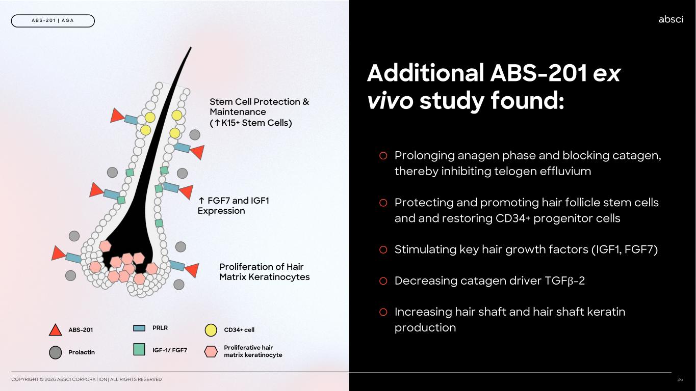 COPYRIGHT © 2026 ABSCI CORPORATION | ALL RIGHTS RESERVED 25 A B S - 2 0 1 | A G A ABS-201 in human ex vivo culture study supports MOA in human scalp follicles ABS-201 significantly prolongs anagen/inhibits catagen and stimulates hair matrix proliferation Anagen Early Catagen Mid Catagen lgG Ctrl ABS-201 lgG +PRL ABS-201 +PRL 80 40 0 100 60 20 Frontotemporal Hairline Region Scalp Punch Scalp Skin o Frontotemporal male scalp skin is the most androgenetic alopecia affected skin region o Organ culture is the most relevant human preclinical hair research tool ex vivo M O D E L S Y S T E M : Microscopic hair cycle staging % o f H Fs in e ac h ha ir cy cl e st ag e