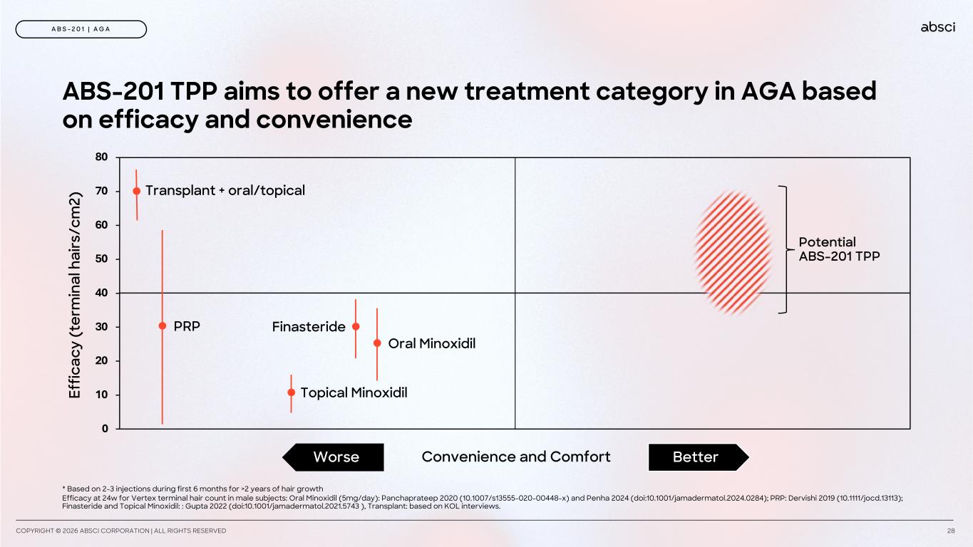 Phase 1/2a trial designed to provide readouts on safety, tolerability, and PoC in AGA Design Elements: o Double-Blind, Placebo-controlled, FIH o Multi-site study in Australia o Dose range ensures predicted >90% RO Population: o Up to 227 male & female healthy participants o SAD; n= 32 healthy volunteers o MAD; n= 147 AGA subjects (Norwood Scale IIIv-V) o Optional AGA cohorts in SAD/MAD; n= 48 o 3:1 randomization Endpoints: o Primary: Safety & Tolerability o Secondary: • PK/PD • Efficacy readouts include target area hair count, width, and darkness (pigmentation) COPYRIGHT © 2026 ABSCI CORPORATION | ALL RIGHTS RESERVED 27 A B S - 2 0 1 | A G A Single Ascending Dose Cohort 1 150mg IV n=8 Cohort 2 450mg IV n=8 Cohort 3 900mg IV n=8 Cohort 4 1800mg IV n=8 Cohort 1 300mg SC n=49 Cohort 2 600mg SC n=49 Cohort 3 1200mg SC n=49 Multiple Ascending Dose (26 weeks) o First cohort fully enrolled and dosed - Enrollment of remaining cohorts ongoing o Dec 2025: Initiated o 1H 2026: PK and interim safety expected o MAD design enabling PoC for AGA o 2Q 2026: Expected initiation o 2H 2026: Expected 13-week interim PoC readout o Early 2027: Expected 26-week topline PoC readout
