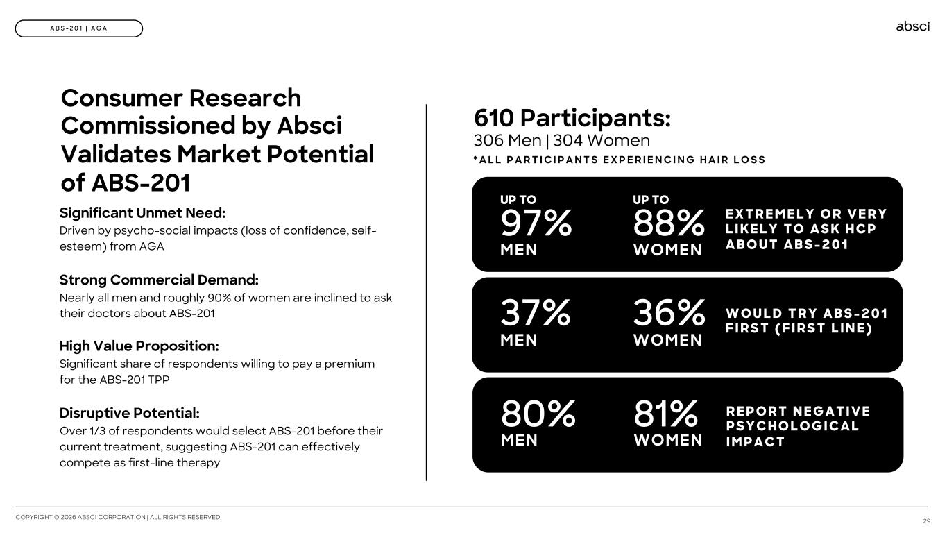 COPYRIGHT © 2026 ABSCI CORPORATION | ALL RIGHTS RESERVED 28 A B S - 2 0 1 | A G A ABS-201 TPP aims to offer a new treatment category in AGA based on efficacy and convenience 0 10 20 30 40 50 60 70 80 Ef fic ac y (t er m in al h ai rs /c m 2) Topical Minoxidil Oral Minoxidil FinasteridePRP Transplant + oral/topical Potential ABS-201 TPP * Based on 2-3 injections during first 6 months for >2 years of hair growth Efficacy at 24w for Vertex terminal hair count in male subjects: Oral Minoxidil (5mg/day): Panchaprateep 2020 (10.1007/s13555-020-00448-x) and Penha 2024 (doi:10.1001/jamadermatol.2024.0284); PRP: Dervishi 2019 (10.1111/jocd.13113); Finasteride and Topical Minoxidil: : Gupta 2022 (doi:10.1001/jamadermatol.2021.5743 ), Transplant: based on KOL interviews. Convenience and Comfort BetterWorse