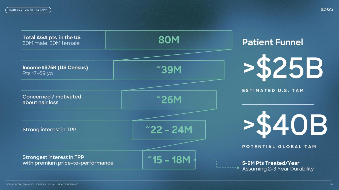 Consumer Research Commissioned by Absci Validates Market Potential of ABS-201 Significant Unmet Need: Driven by psycho-social impacts (loss of confidence, self- esteem) from AGA Strong Commercial Demand: Nearly all men and roughly 90% of women are inclined to ask their doctors about ABS-201 High Value Proposition: Significant share of respondents willing to pay a premium for the ABS-201 TPP Disruptive Potential: Over 1/3 of respondents would select ABS-201 before their current treatment, suggesting ABS-201 can effectively compete as first-line therapy 610 Participants: 306 Men | 304 Women COPYRIGHT © 2026 ABSCI CORPORATION | ALL RIGHTS RESERVED 29 A B S - 2 0 1 | A G A * A L L P A R T I C I P A N T S E X P E R I E N C I N G H A I R L O S S R E P O R T N E G A T I V E P S Y C H O L O G I C A L I M P A C T 80% MEN 81% WOMEN W O U L D T R Y A B S - 2 0 1 F I R S T ( F I R S T L I N E )37% MEN 36% WOMEN E X T R E M E L Y O R V E R Y L I K E L Y T O A S K H C P A B O U T A B S - 2 0 1 UP TO 97% MEN WOMEN UP TO 88%