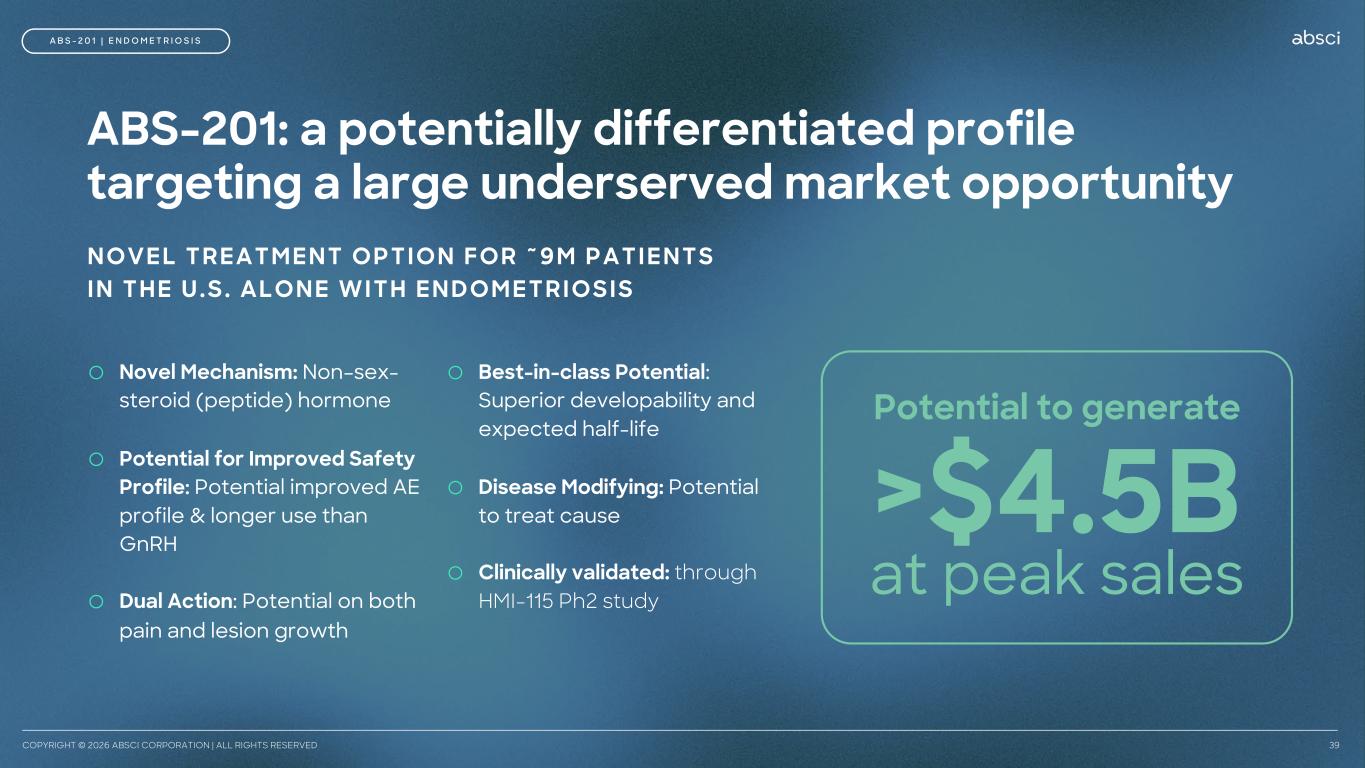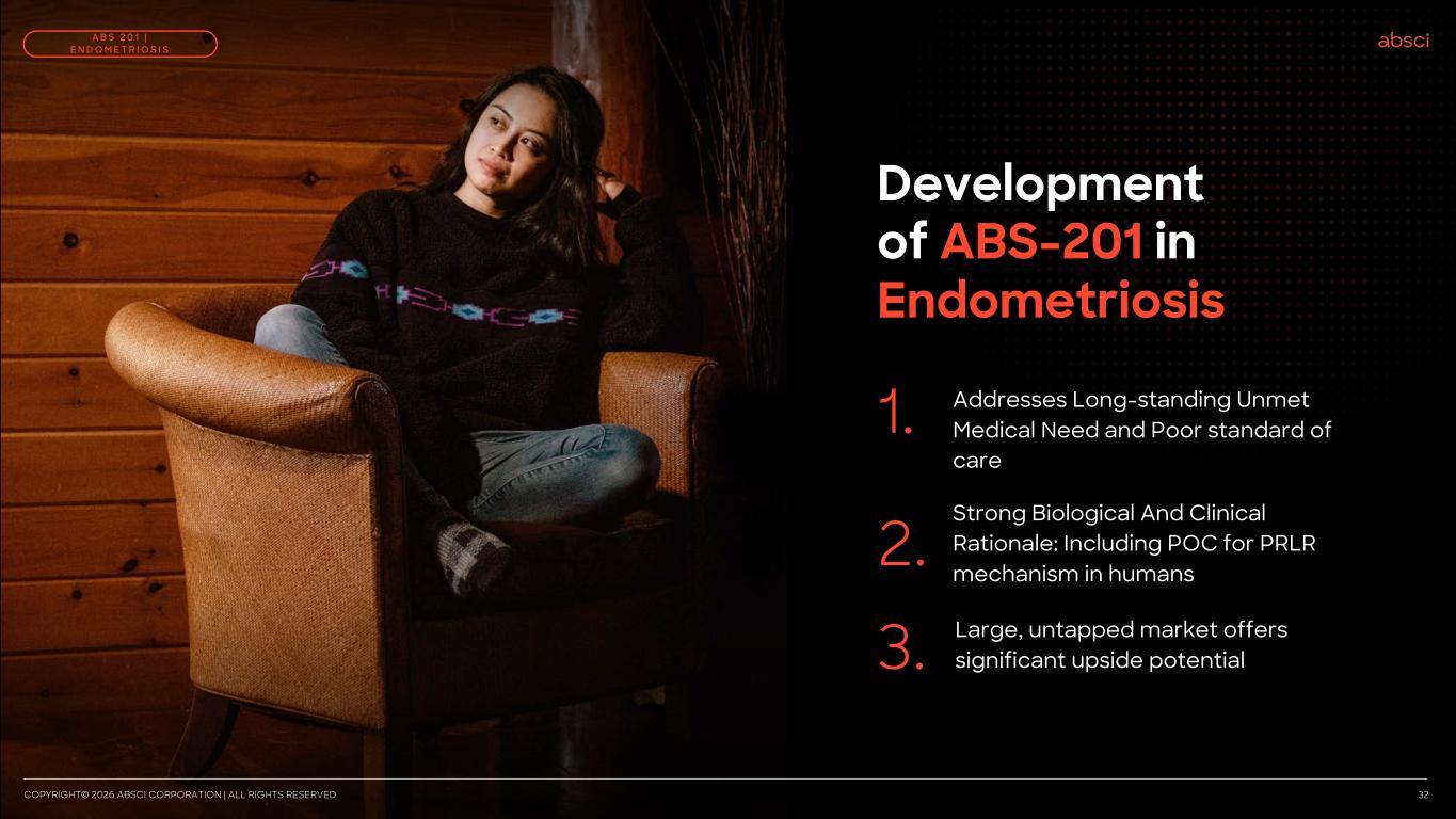 •ABS-201 (anti-PRLR antibody) for endometriosis: Absci is also developing ABS-201 for endometriosis, a large, underserved market with significant unmet medical need and poor standard of care. Endometriosis is prevalent in up to 10% of women worldwide, including an estimated 9 million women in the U.S., and there is currently no FDA-approved disease-modifying therapy. ABS-201 for endometriosis represents a novel mechanism (non-sex steroid hormone), with potential to be disease-modifying, act on both pain and lesion growth, and offer an improved safety profile. Absci anticipates initiation of a Phase 2 clinical trial for endometriosis in the fourth quarter of 2026, with potential proof-of-concept data in the second half of 2027.