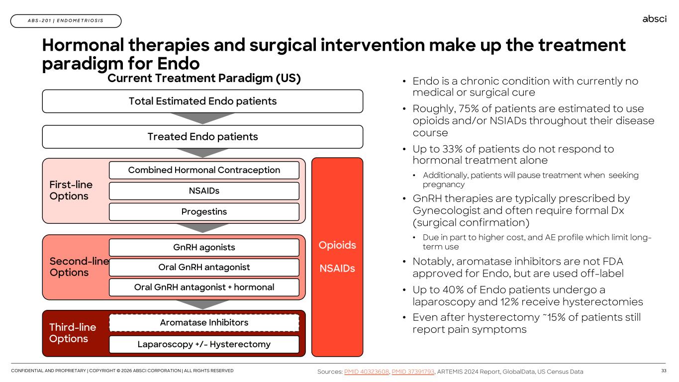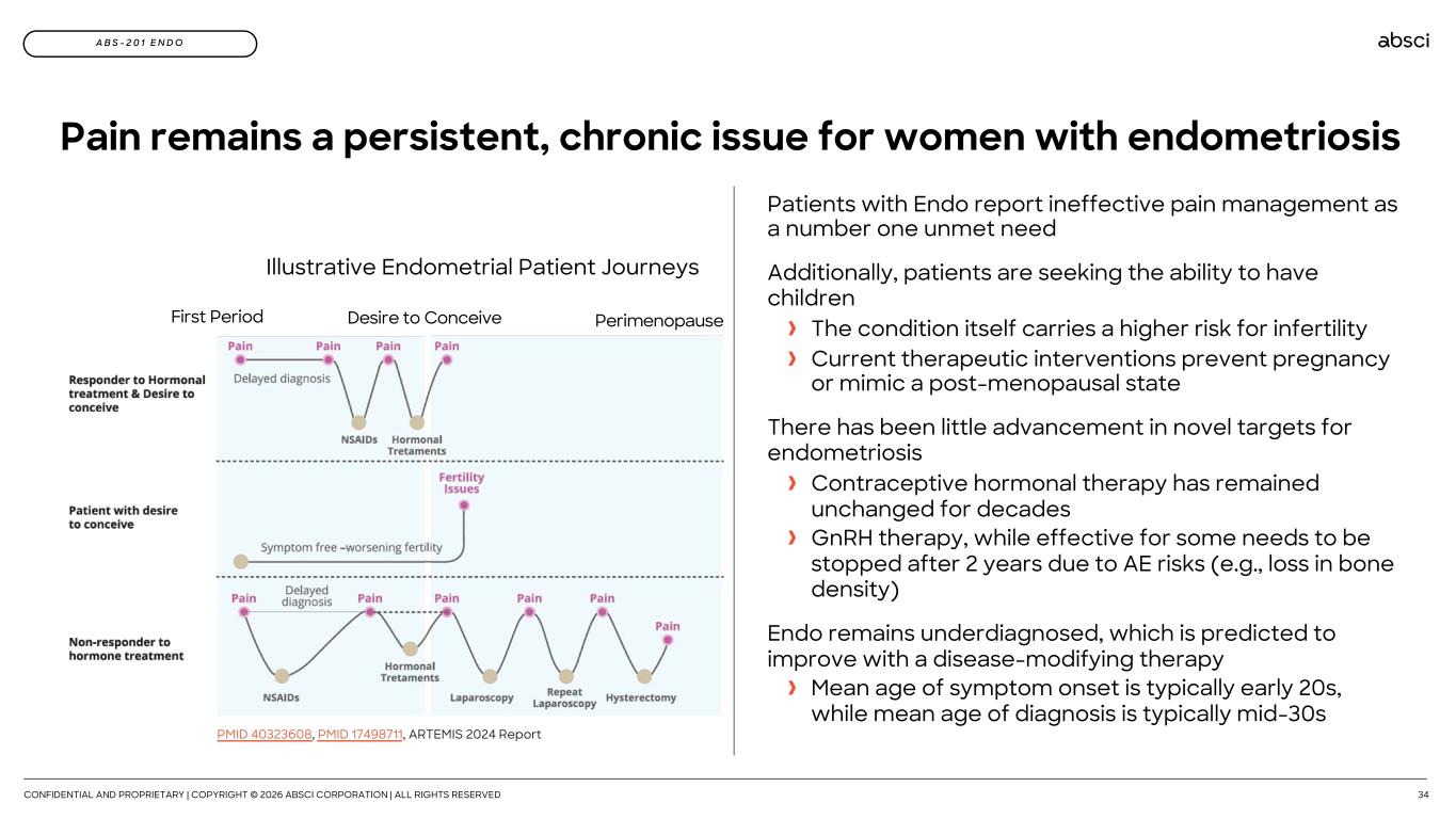 CONFIDENTIAL AND PROPRIETARY | COPYRIGHT © 2026 ABSCI CORPORATION | ALL RIGHTS RESERVED 33 A B S - 2 0 1 | E N D O M E T R I O S I S Hormonal therapies and surgical intervention make up the treatment paradigm for Endo • Endo is a chronic condition with currently no medical or surgical cure • Roughly, 75% of patients are estimated to use opioids and/or NSIADs throughout their disease course • Up to 33% of patients do not respond to hormonal treatment alone • Additionally, patients will pause treatment when seeking pregnancy • GnRH therapies are typically prescribed by Gynecologist and often require formal Dx (surgical confirmation) • Due in part to higher cost, and AE profile which limit long- term use • Notably, aromatase inhibitors are not FDA approved for Endo, but are used off-label • Up to 40% of Endo patients undergo a laparoscopy and 12% receive hysterectomies • Even after hysterectomy ~15% of patients still report pain symptoms Sources: PMID 40323608, PMID 37391793, ARTEMIS 2024 Report, GlobalData, US Census Data Current Treatment Paradigm (US) Treated Endo patients First-line Options Combined Hormonal Contraception NSAIDs Progestins Second-line Options GnRH agonists Oral GnRH antagonist Oral GnRH antagonist + hormonal Total Estimated Endo patients Opioids NSAIDs Third-line Options Aromatase Inhibitors Laparoscopy +/- Hysterectomy