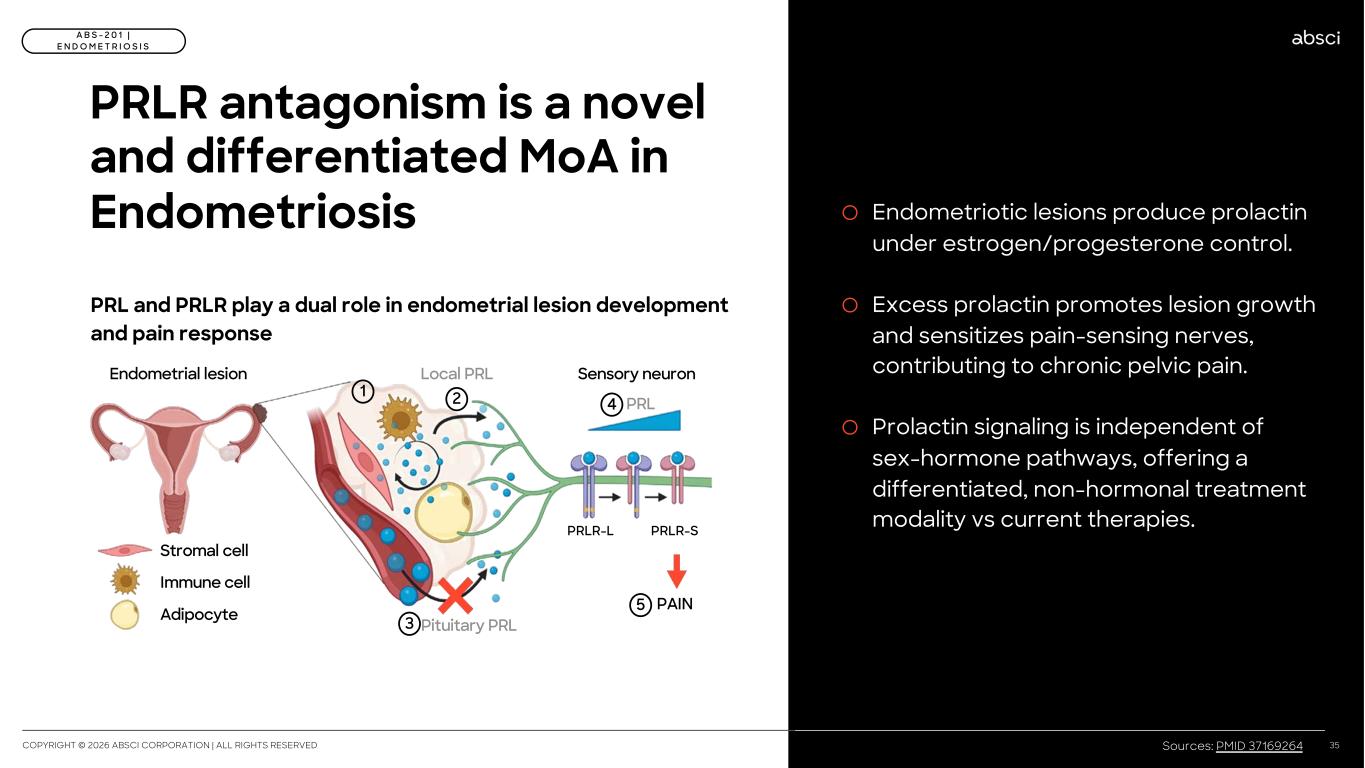 o Endometriotic lesions produce prolactin under estrogen/progesterone control. o Excess prolactin promotes lesion growth and sensitizes pain-sensing nerves, contributing to chronic pelvic pain. o Prolactin signaling is independent of sex-hormone pathways, offering a differentiated, non-hormonal treatment modality vs current therapies. COPYRIGHT © 2026 ABSCI CORPORATION | ALL RIGHTS RESERVED 35 A B S - 2 0 1 | E N D O M E T R I O S I S PRLR antagonism is a novel and differentiated MoA in Endometriosis PRL and PRLR play a dual role in endometrial lesion development and pain response Stromal cell Immune cell Adipocyte PRL 1 2 Endometrial lesion Local PRL PRLR-L PRLR-S Sensory neuron PAIN Pituitary PRL3 5 4 Sources: PMID 37169264