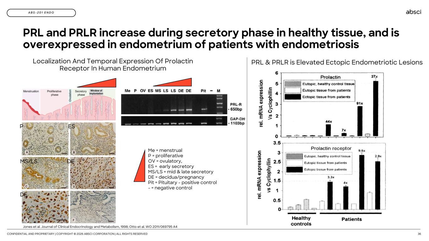 CONFIDENTIAL AND PROPRIETARY | COPYRIGHT © 2026 ABSCI CORPORATION | ALL RIGHTS RESERVED 36 A B S - 2 0 1 E N D O Localization And Temporal Expression Of Prolactin Receptor In Human Endometrium PRL and PRLR increase during secretory phase in healthy tissue, and is overexpressed in endometrium of patients with endometriosis Me = menstrual P = proliferative OV = ovulatory, ES = early secretory MS/LS = mid & late secretory DE = decidua/pregnancy Pit = Pituitary - positive control - = negative control P ES MS/LS DE DE - PRL & PRLR is Elevated Ectopic Endometriotic Lesions Jones et al. Journal of Clinical Endocrinology and Metabolism, 1998; Otto et al. WO 2011/069795 A4