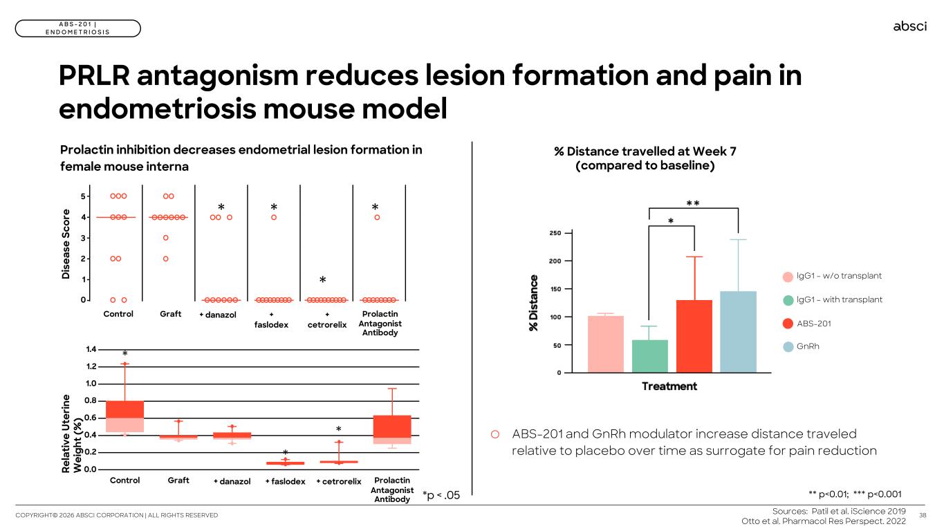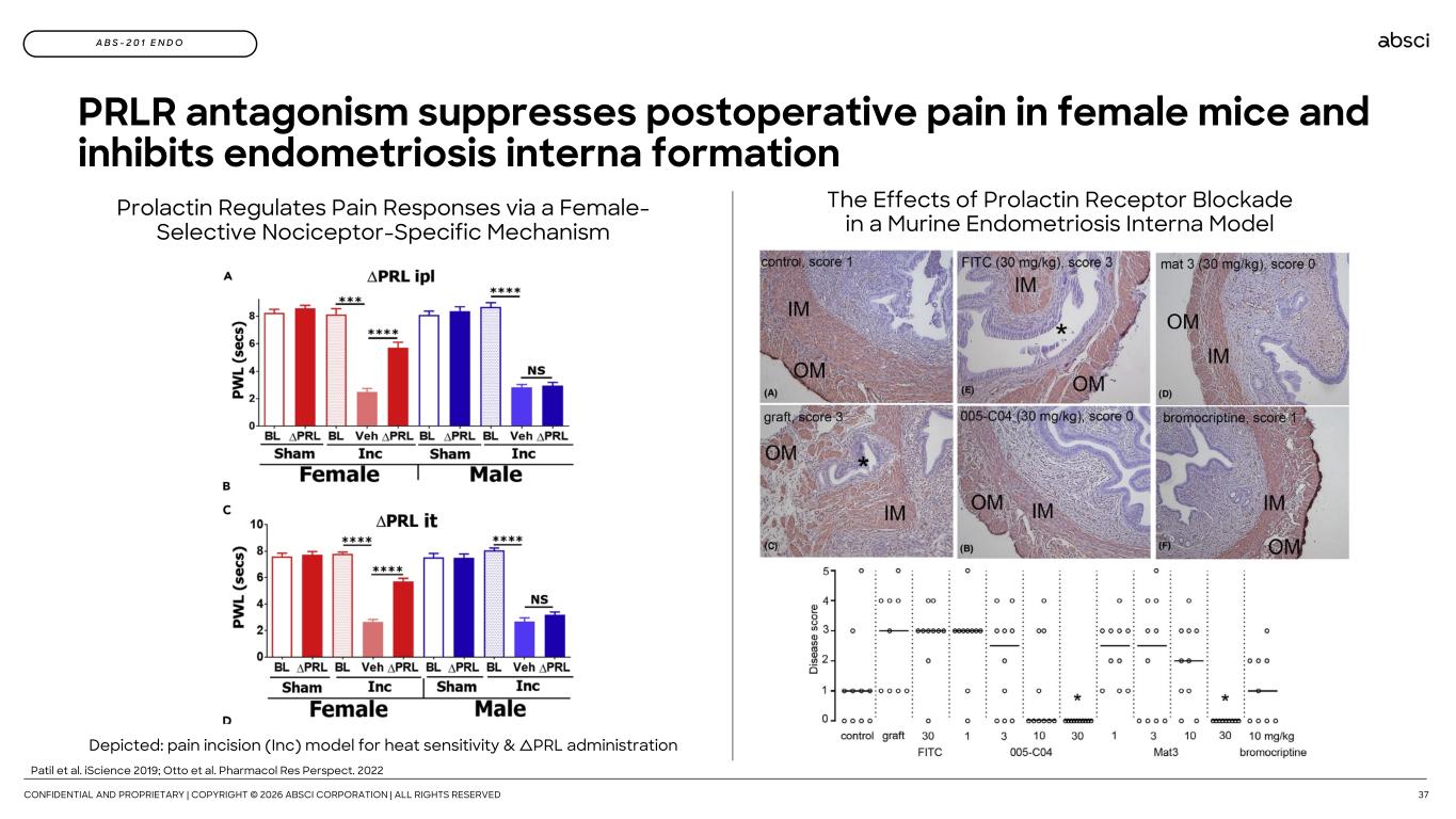 CONFIDENTIAL AND PROPRIETARY | COPYRIGHT © 2026 ABSCI CORPORATION | ALL RIGHTS RESERVED 37 A B S - 2 0 1 E N D O Prolactin Regulates Pain Responses via a Female- Selective Nociceptor-Specific Mechanism PRLR antagonism suppresses postoperative pain in female mice and inhibits endometriosis interna formation The Effects of Prolactin Receptor Blockade in a Murine Endometriosis Interna Model Patil et al. iScience 2019; Otto et al. Pharmacol Res Perspect. 2022 Depicted: pain incision (Inc) model for heat sensitivity & ∆PRL administration