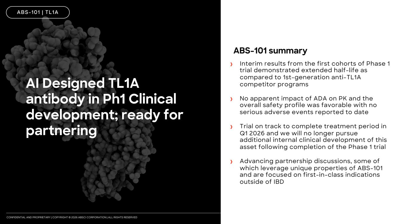 CONFIDENTIAL AND PROPRIETARY | COPYRIGHT © 2026 ABSCI CORPORATION | ALL RIGHTS RESERVED ABS-101 | TL1A AI Designed TL1A antibody in Ph1 Clinical development; ready for partnering 2024 20252024 2025 2026 Interim results from the first cohorts of Phase 1 trial demonstrated extended half-life as compared to 1st-generation anti-TL1A competitor programs No apparent impact of ADA on PK and the overall safety profile was favorable with no serious adverse events reported to date Trial on track to complete treatment period in Q1 2026 and we will no longer pursue additional internal clinical development of this asset following completion of the Phase 1 trial Advancing partnership discussions, some of which leverage unique properties of ABS-101 and are focused on first-in-class indications outside of IBD ABS-101 summary