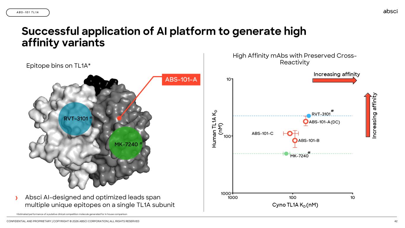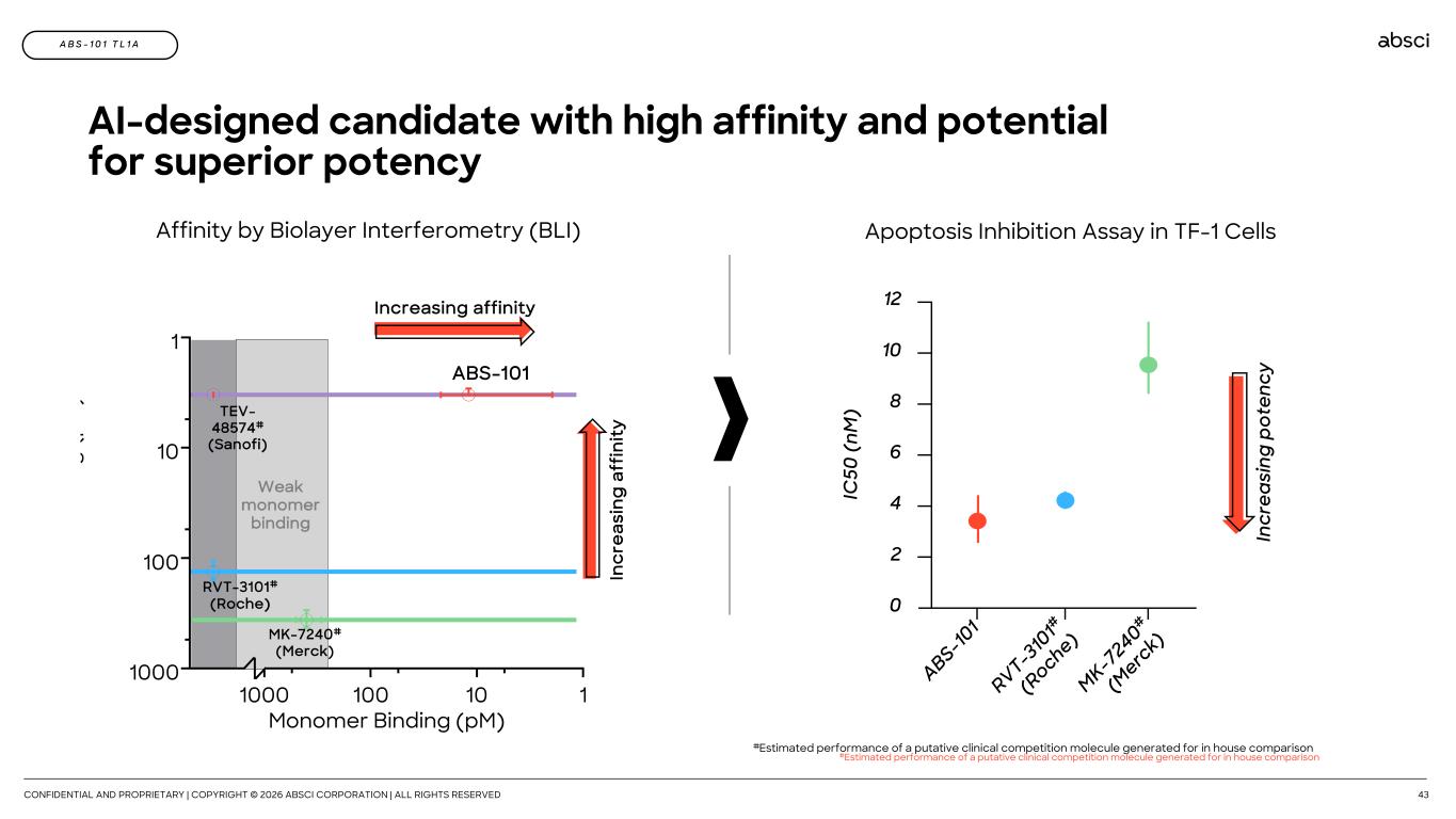 CONFIDENTIAL AND PROPRIETARY | COPYRIGHT © 2026 ABSCI CORPORATION | ALL RIGHTS RESERVED 43 AI-designed candidate with high affinity and potential for superior potency A B S - 1 0 1 T L 1 A Affinity by Biolayer Interferometry (BLI) Apoptosis Inhibition Assay in TF-1 Cells 1101001000 1 10 100 1000 Monomer Binding (pM) Tr im er B in di ng (p M ) No M onom er Binding Increasing affinity In cr e as in g a ff in it y Weak monomer binding ABS-101 RVT-3101# (Roche) MK-7240# (Merck) TEV- 48574# (Sanofi) In cr ea si ng p ot en cy IC 50 ( nM ) 0 2 4 6 8 10 12 ABS-10 1 RVT-3 10 1# (R oche) MK-7 240 # (M erc k) #Estimated performance of a putative clinical competition molecule generated for in house comparison #Estimated performance of a putative clinical competition molecule generated for in house comparison
