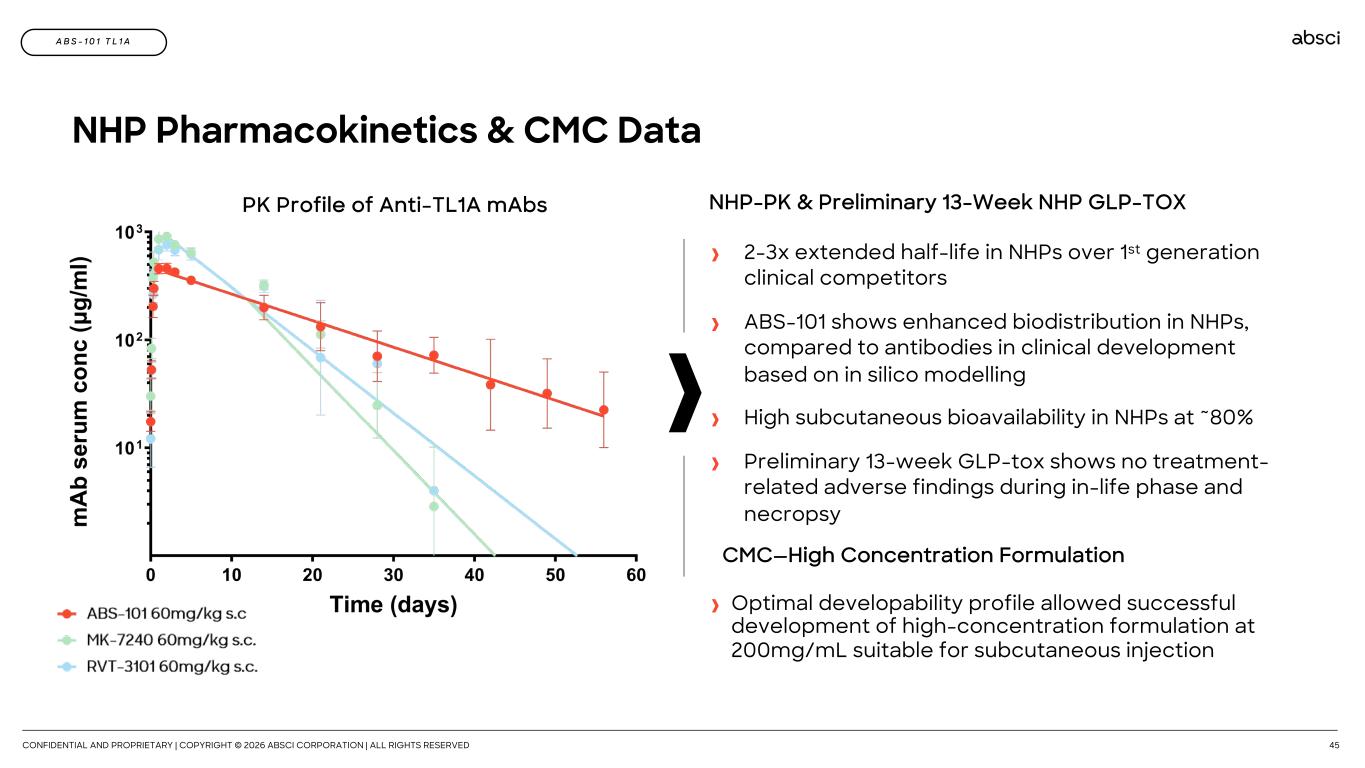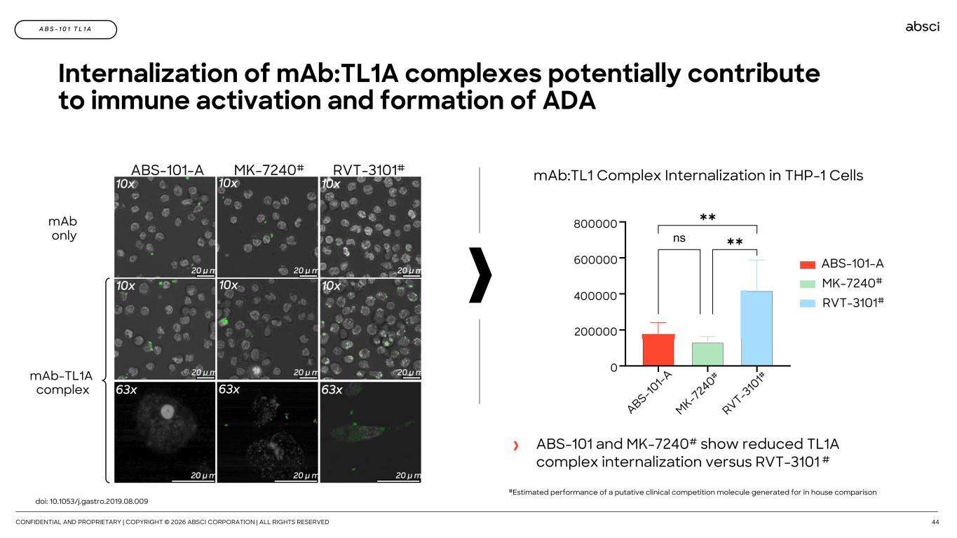 CONFIDENTIAL AND PROPRIETARY | COPYRIGHT © 2026 ABSCI CORPORATION | ALL RIGHTS RESERVED 44 Internalization of mAb:TL1A complexes potentially contribute to immune activation and formation of ADA A B S - 1 0 1 T L 1 A mAb:TL1 Complex Internalization in THP-1 Cells mAb only ABS-101-A RVT-3101#MK-7240# 10x 10x 10x 10x 10x 10x 63x 63x 63x 20 µ m 20 µ m 20 µ m 20 µ m 20 µ m 20 µ m 20 µ m 20 µ m 20 µ m mAb-TL1A complex doi: 10.1053/j.gastro.2019.08.009 AB S- 10 1 MK -7 24 0 RV T- 31 01 0 200000 400000 600000 800000 C or re ct ed T ot al C el l Fl uo re sc en ce ( C TC F) ABS-101 MK-7240 RVT-3101 ns ✱✱ ✱✱ -A # 1 1# ABS-10 1-A MK-7 240# RVT-3 10 1# ABS-101 and MK-7240# show reduced TL1A complex internalization versus RVT-3101 # #Estimated performance of a putative clinical competition molecule generated for in house comparison
