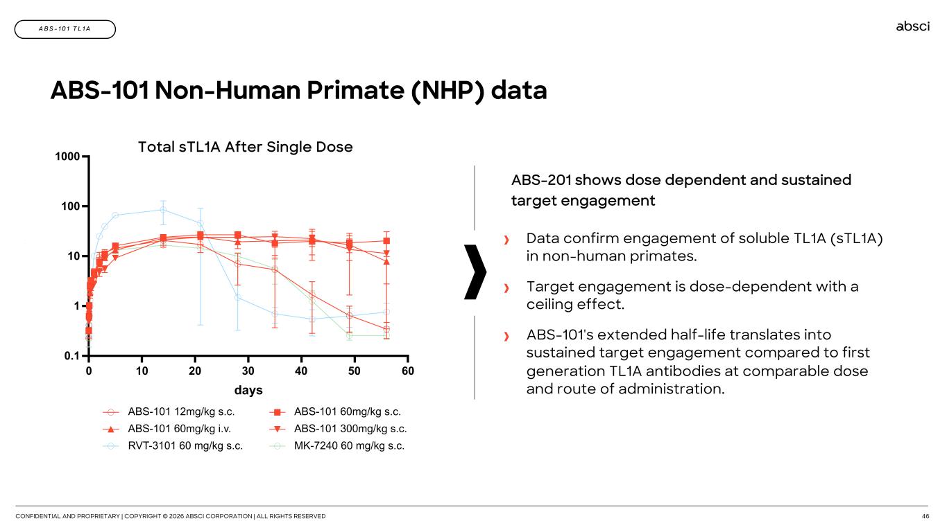 CONFIDENTIAL AND PROPRIETARY | COPYRIGHT © 2026 ABSCI CORPORATION | ALL RIGHTS RESERVED 46 ABS-101 Non-Human Primate (NHP) data A B S - 1 0 1 T L 1 A Data confirm engagement of soluble TL1A (sTL1A) in non-human primates. Target engagement is dose-dependent with a ceiling effect. ABS-101's extended half-life translates into sustained target engagement compared to first generation TL1A antibodies at comparable dose and route of administration. ABS-201 shows dose dependent and sustained target engagement 0 10 20 30 40 50 60 0.1 1 10 100 1000 days sT L1 A ng /m l ABS-101 12mg/kg s.c. ABS-101 60mg/kg s.c. ABS-101 60mg/kg i.v. ABS-101 300mg/kg s.c. RVT-3101 60 mg/kg s.c. MK-7240 60 mg/kg s.c. Total sTL1A After Single Dose