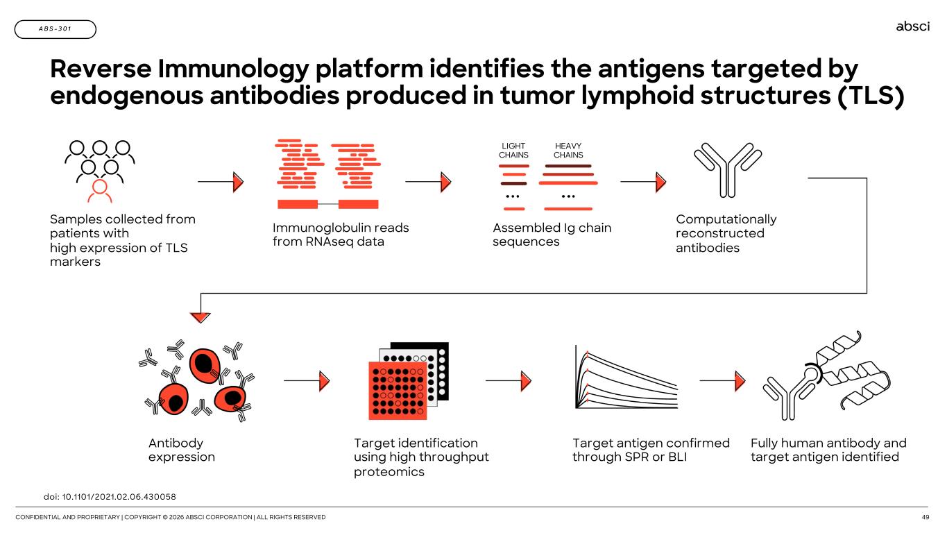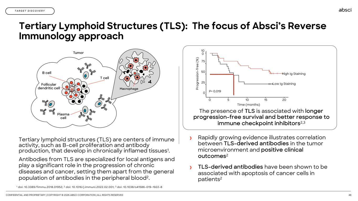 CONFIDENTIAL AND PROPRIETARY | COPYRIGHT © 2026 ABSCI CORPORATION | ALL RIGHTS RESERVED 48 Tertiary Lymphoid Structures (TLS): The focus of Absci’s Reverse Immunology approach T A R G E T D I S C O V E R Y Rapidly growing evidence illustrates correlation between TLS-derived antibodies in the tumor microenvironment and positive clinical outcomes2 TLS-derived antibodies have been shown to be associated with apoptosis of cancer cells in patients2 Tertiary lymphoid structures (TLS) are centers of immune activity, such as B-cell proliferation and antibody production, that develop in chronically inflamed tissues1. Antibodies from TLS are specialized for local antigens and play a significant role in the progression of chronic diseases and cancer, setting them apart from the general population of antibodies in the peripheral blood2. The presence of TLS is associated with longer progression-free survival and better response to immune checkpoint inhibitors2,3 10 0 75 50 25 10 15 20 0 0 5 High Ig Staining Low Ig Staining P ro gr es si on -f re e (% ) Time (months) P= 0.019 1 doi: 10.3389/fimmu.2018.01952; 2 doi: 10.1016/j.immuni.2022.02.001; 3 doi: 10.1038/s41586-019-1922-8