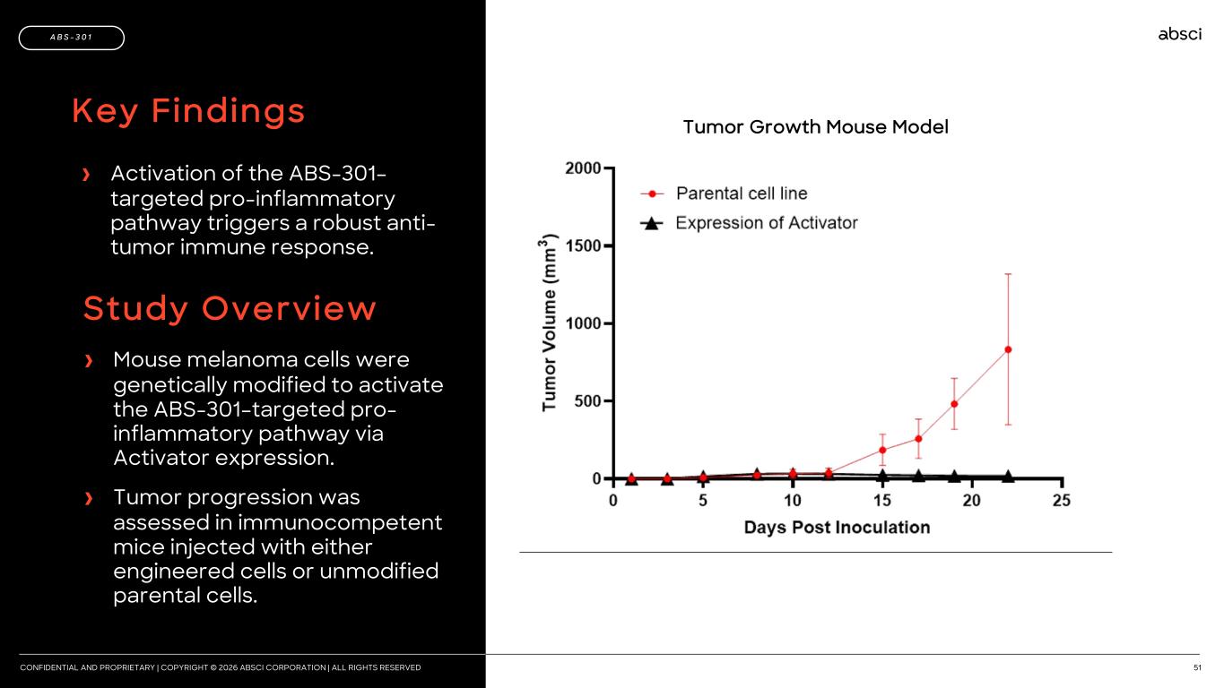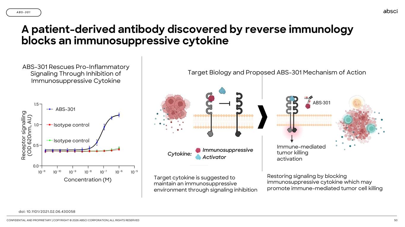 CONFIDENTIAL AND PROPRIETARY | COPYRIGHT © 2026 ABSCI CORPORATION | ALL RIGHTS RESERVED 50 A patient-derived antibody discovered by reverse immunology blocks an immunosuppressive cytokine A B S - 3 0 1 doi: 10.1101/2021.02.06.430058 ABS-301 Rescues Pro-Inflammatory Signaling Through Inhibition of Immunosuppressive Cytokine Re ce pt or s ig na llin g (O D 6 20 nm , A U ) ABS-301 Isotype control Isotype control Concentration (M) Restoring signaling by blocking immunosuppressive cytokine which may promote immune-mediated tumor cell killing Target cytokine is suggested to maintain an immunosuppressive environment through signaling inhibition Immunosuppressive Activator Immune-mediated tumor killing activation Cytokine: Target Biology and Proposed ABS-301 Mechanism of Action