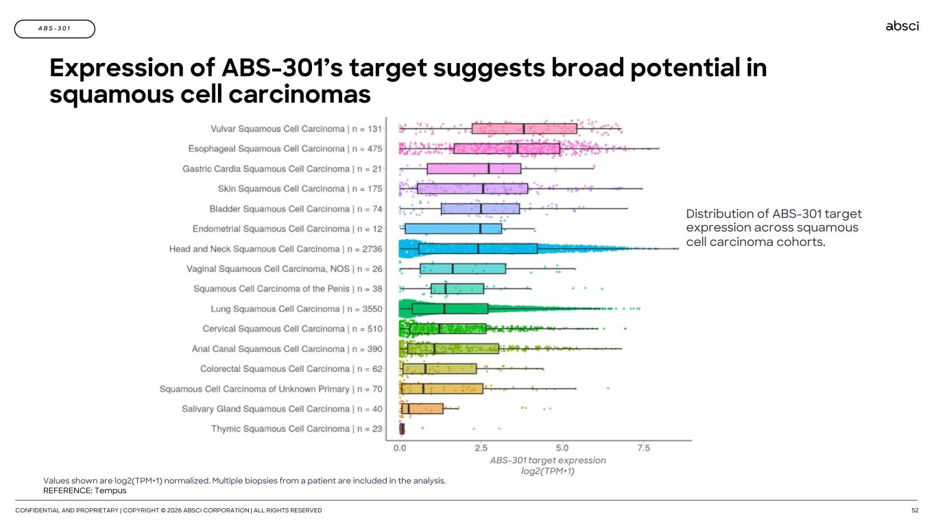 CONFIDENTIAL AND PROPRIETARY | COPYRIGHT © 2026 ABSCI CORPORATION | ALL RIGHTS RESERVED 52 Expression of ABS-301’s target suggests broad potential in squamous cell carcinomas A B S - 3 0 1 Values shown are log2(TPM+1) normalized. Multiple biopsies from a patient are included in the analysis. REFERENCE: Tempus ABS-301 target expression log2(TPM+1) Distribution of ABS-301 target expression across squamous cell carcinoma cohorts.