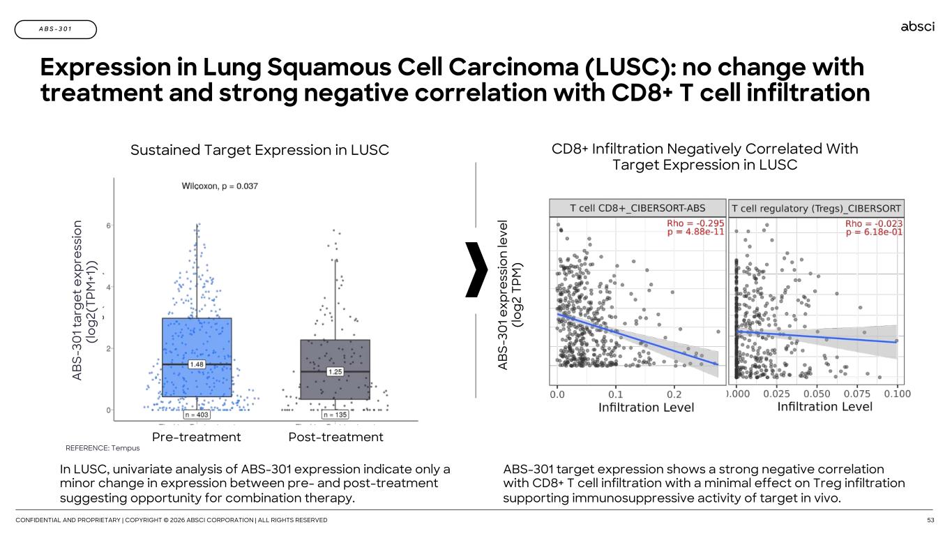 CONFIDENTIAL AND PROPRIETARY | COPYRIGHT © 2026 ABSCI CORPORATION | ALL RIGHTS RESERVED 53 Expression in Lung Squamous Cell Carcinoma (LUSC): no change with treatment and strong negative correlation with CD8+ T cell infiltration A B S - 3 0 1 Pre-treatment Post-treatment A B S- 30 1 t ar ge t e xp re ss io n (lo g2 (T PM +1 )) Sustained Target Expression in LUSC CD8+ Infiltration Negatively Correlated With Target Expression in LUSC In LUSC, univariate analysis of ABS-301 expression indicate only a minor change in expression between pre- and post-treatment suggesting opportunity for combination therapy. A B S- 30 1 e xp re ss io n le ve l (lo g2 T PM ) REFERENCE: Tempus ABS-301 target expression shows a strong negative correlation with CD8+ T cell infiltration with a minimal effect on Treg infiltration supporting immunosuppressive activity of target in vivo.