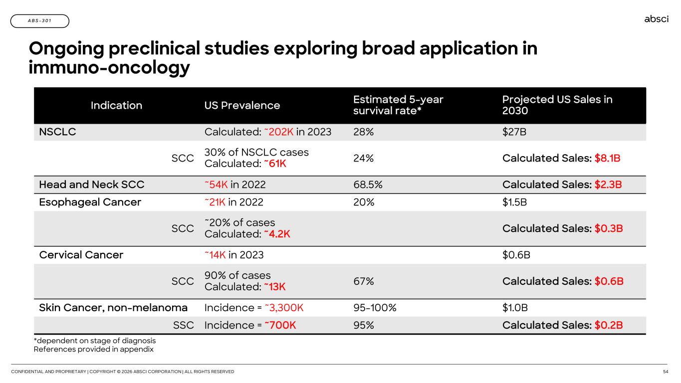 CONFIDENTIAL AND PROPRIETARY | COPYRIGHT © 2026 ABSCI CORPORATION | ALL RIGHTS RESERVED 54 Ongoing preclinical studies exploring broad application in immuno-oncology A B S - 3 0 1 Based on literature and potential competitive molecules, the following indications could be of interest: Indication US Prevalence Estimated 5-year survival rate* Projected US Sales in 2030 NSCLC Calculated: ~202K in 2023 28% $27B SCC 30% of NSCLC cases Calculated: ~61K 24% Calculated Sales: $8.1B Head and Neck SCC ~54K in 2022 68.5% Calculated Sales: $2.3B Esophageal Cancer ~21K in 2022 20% $1.5B SCC ~20% of cases Calculated: ~4.2K Calculated Sales: $0.3B Cervical Cancer ~14K in 2023 $0.6B SCC 90% of cases Calculated: ~13K 67% Calculated Sales: $0.6B Skin Cancer, non-melanoma Incidence = ~3,300K 95-100% $1.0B SSC Incidence = ~700K 95% Calculated Sales: $0.2B *dependent on stage of diagnosis References provided in appendix
