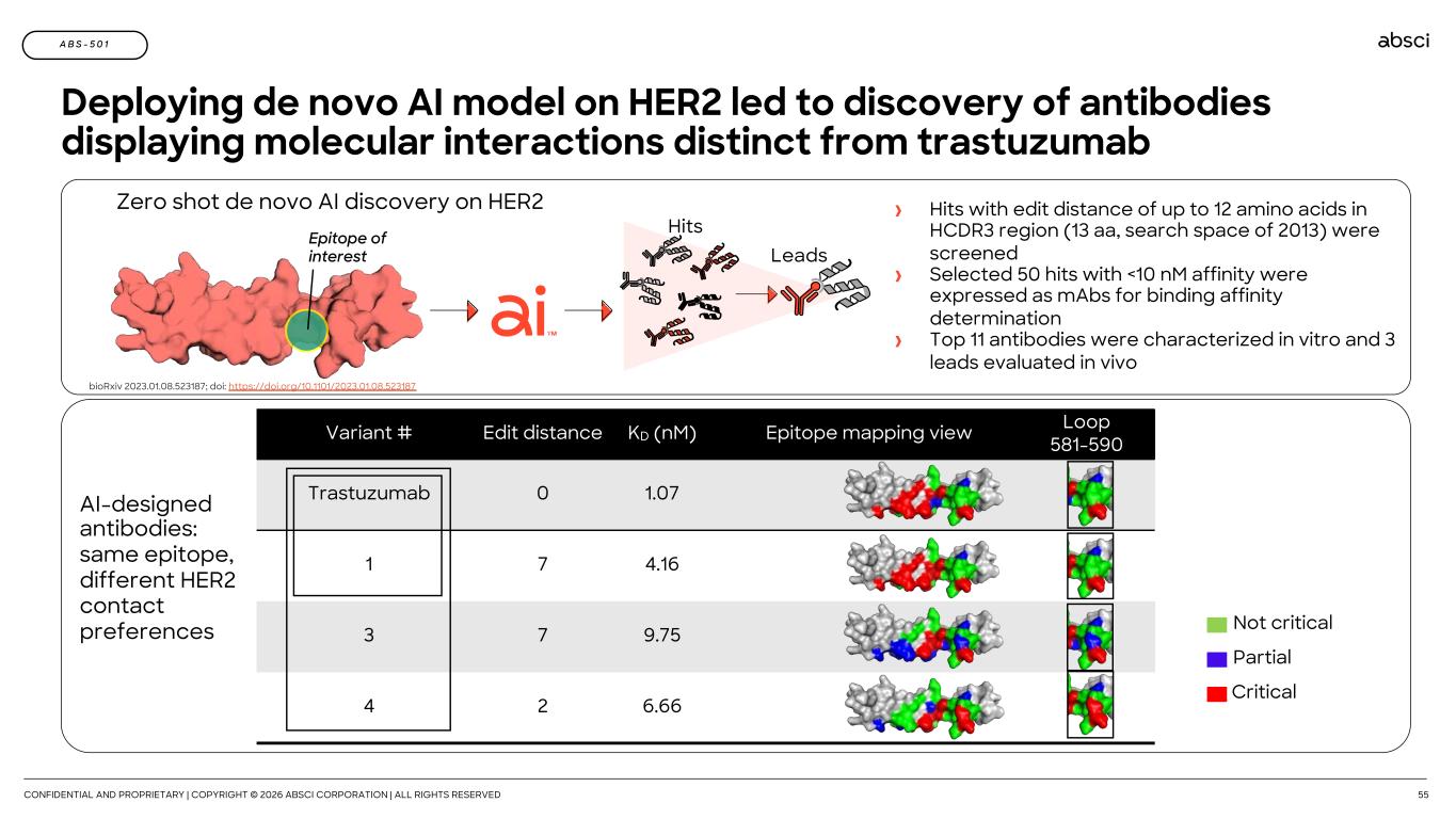 CONFIDENTIAL AND PROPRIETARY | COPYRIGHT © 2026 ABSCI CORPORATION | ALL RIGHTS RESERVED 55 Deploying de novo AI model on HER2 led to discovery of antibodies displaying molecular interactions distinct from trastuzumab A B S - 5 0 1 Zero shot de novo AI discovery on HER2 Hits with edit distance of up to 12 amino acids in HCDR3 region (13 aa, search space of 2013) were screened Selected 50 hits with <10 nM affinity were expressed as mAbs for binding affinity determination Top 11 antibodies were characterized in vitro and 3 leads evaluated in vivo Variant # Edit distance KD (nM) Epitope mapping view Loop 581-590 Trastuzumab 0 1.07 1 7 4.16 3 7 9.75 4 2 6.66 Critical Not critical Partial AI-designed antibodies: same epitope, different HER2 contact preferences Epitope of interest Hits Leads bioRxiv 2023.01.08.523187; doi: https://doi.org/10.1101/2023.01.08.523187