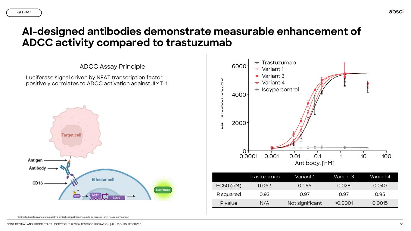 CONFIDENTIAL AND PROPRIETARY | COPYRIGHT © 2026 ABSCI CORPORATION | ALL RIGHTS RESERVED 56 AI-designed antibodies demonstrate measurable enhancement of ADCC activity compared to trastuzumab A B S - 5 0 1 ADCC Assay Principle #Estimated performance of a putative clinical competition molecule generated for in house comparison Luciferase signal driven by NFAT transcription factor positively correlates to ADCC activation against JIMT-1 Trastuzumab Variant 1 Variant 3 Variant 4 EC50 (nM) 0.062 0.056 0.028 0.040 R squared 0.93 0.97 0.97 0.95 P value N/A Not significant <0.0001 0.0015 0.0001 0.001 0.01 0.1 1 10 100 0 2000 4000 6000 Antibody, [nM] Lu m in es ce nc e, A U Trastuzumab Variant 1 Variant 3 Variant 4 Isoype control