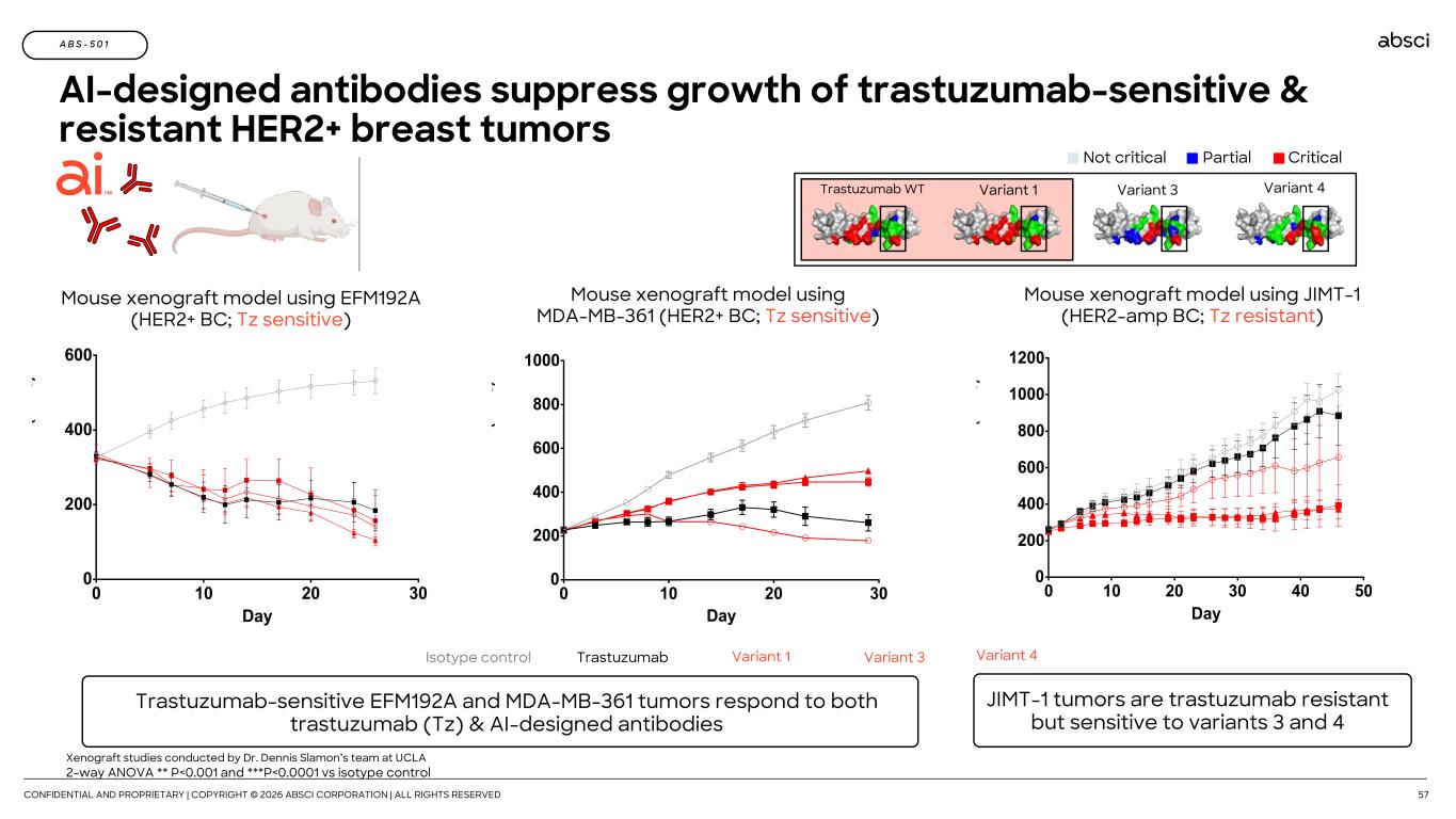 CONFIDENTIAL AND PROPRIETARY | COPYRIGHT © 2026 ABSCI CORPORATION | ALL RIGHTS RESERVED 57 AI-designed antibodies suppress growth of trastuzumab-sensitive & resistant HER2+ breast tumors A B S - 5 0 1 Mouse xenograft model using EFM192A (HER2+ BC; Tz sensitive) Mouse xenograft model using JIMT-1 (HER2-amp BC; Tz resistant) Isotype control Trastuzumab Variant 1 Variant 3 Variant 4 0 10 20 30 0 200 400 600 Day Tu m or v ol um e (m m 3) 0 10 20 30 40 50 0 200 400 600 800 1000 1200 Day Tu m or v ol um e (m m 3) Mouse xenograft model using MDA-MB-361 (HER2+ BC; Tz sensitive) 0 10 20 30 0 200 400 600 800 1000 Day Tu m or v ol um e (m m 3) Trastuzumab-sensitive EFM192A and MDA-MB-361 tumors respond to both trastuzumab (Tz) & AI-designed antibodies JIMT-1 tumors are trastuzumab resistant but sensitive to variants 3 and 4 Partial Critical Not critical Trastuzumab WT Variant 1 Variant 3 Variant 4 Xenograft studies conducted by Dr. Dennis Slamon’s team at UCLA 2-way ANOVA ** P<0.001 and ***P<0.0001 vs isotype control