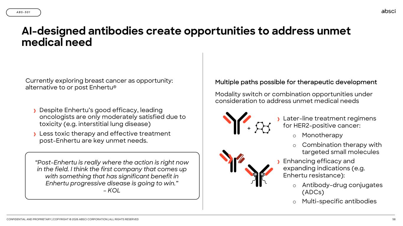 CONFIDENTIAL AND PROPRIETARY | COPYRIGHT © 2026 ABSCI CORPORATION | ALL RIGHTS RESERVED 58 AI-designed antibodies create opportunities to address unmet medical need A B S - 5 0 1 Currently exploring breast cancer as opportunity: alternative to or post Enhertu® Later-line treatment regimens for HER2-positive cancer: o Monotherapy o Combination therapy with targeted small molecules Enhancing efficacy and expanding indications (e.g. Enhertu resistance): o Antibody-drug conjugates (ADCs) o Multi-specific antibodies “Post-Enhertu is really where the action is right now in the field. I think the first company that comes up with something that has significant benefit in Enhertu progressive disease is going to win.” – KOL Multiple paths possible for therapeutic development Despite Enhertu’s good efficacy, leading oncologists are only moderately satisfied due to toxicity (e.g. interstitial lung disease) Less toxic therapy and effective treatment post-Enhertu are key unmet needs. + Modality switch or combination opportunities under consideration to address unmet medical needs