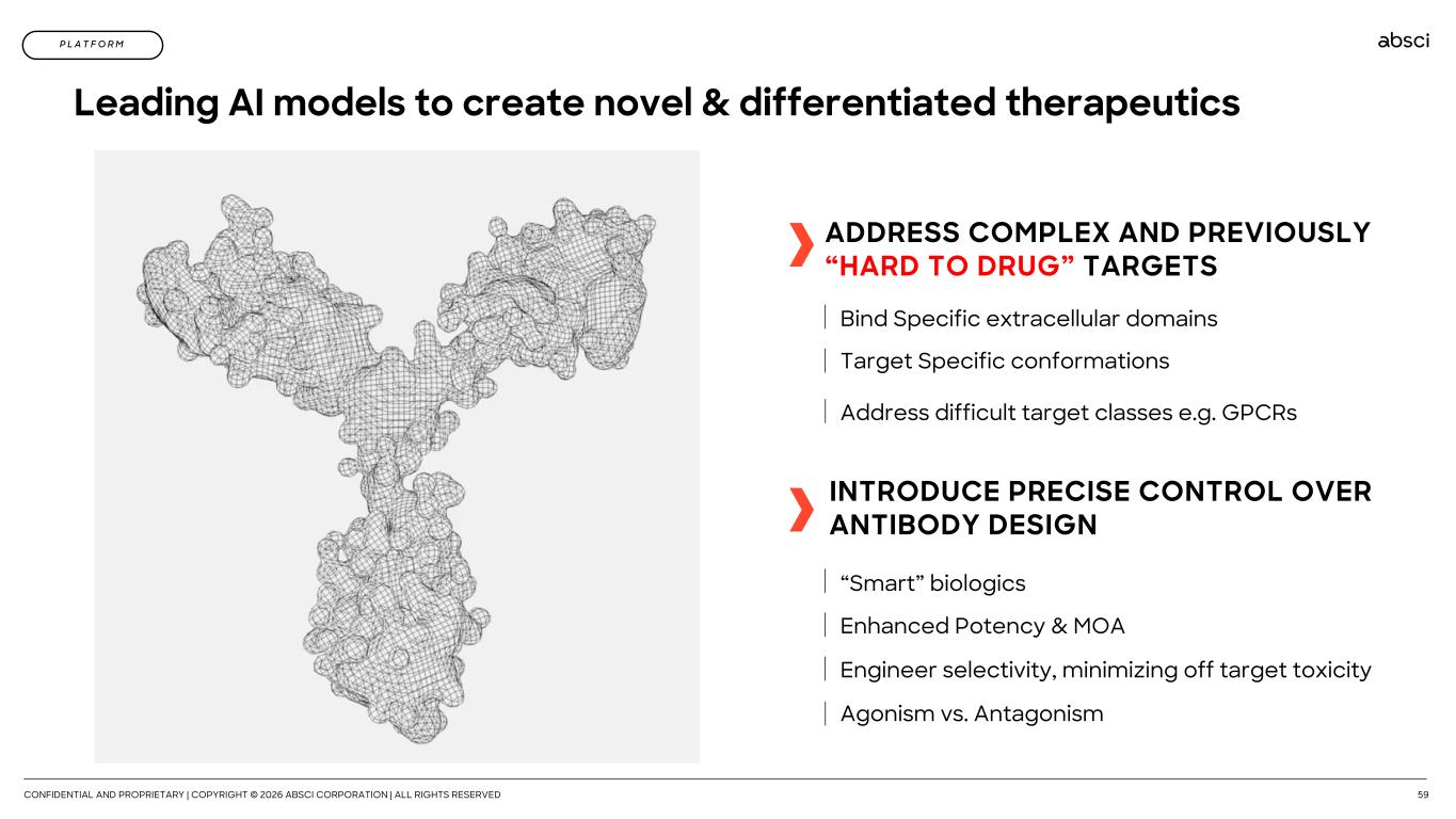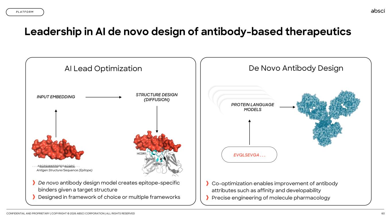 CONFIDENTIAL AND PROPRIETARY | COPYRIGHT © 2026 ABSCI CORPORATION | ALL RIGHTS RESERVED 59 P L A T F O R M Leading AI models to create novel & differentiated therapeutics “Smart” biologics Enhanced Potency & MOA Engineer selectivity, minimizing off target toxicity Agonism vs. Antagonism Bind Specific extracellular domains Target Specific conformations Address difficult target classes e.g. GPCRs ADDRESS COMPLEX AND PREVIOUSLY “HARD TO DRUG” TARGETS INTRODUCE PRECISE CONTROL OVER ANTIBODY DESIGN