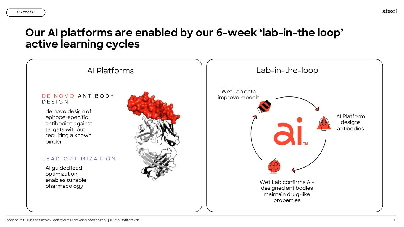 CONFIDENTIAL AND PROPRIETARY | COPYRIGHT © 2026 ABSCI CORPORATION | ALL RIGHTS RESERVED 60 P L A T F O R M Leadership in AI de novo design of antibody-based therapeutics De Novo Antibody DesignAI Lead Optimization De novo antibody design model creates epitope-specific binders given a target structure Designed in framework of choice or multiple frameworks INPUT EMBEDDING STRUCTURE DESIGN (DIFFUSION) . . . ARCPSIWKFPDEEGACQPC . . . Antigen Structure/Sequence (Epitope) EVQLSEVGA . . . PROTEIN LANGUAGE MODELS Co-optimization enables improvement of antibody attributes such as affinity and developability Precise engineering of molecule pharmacology