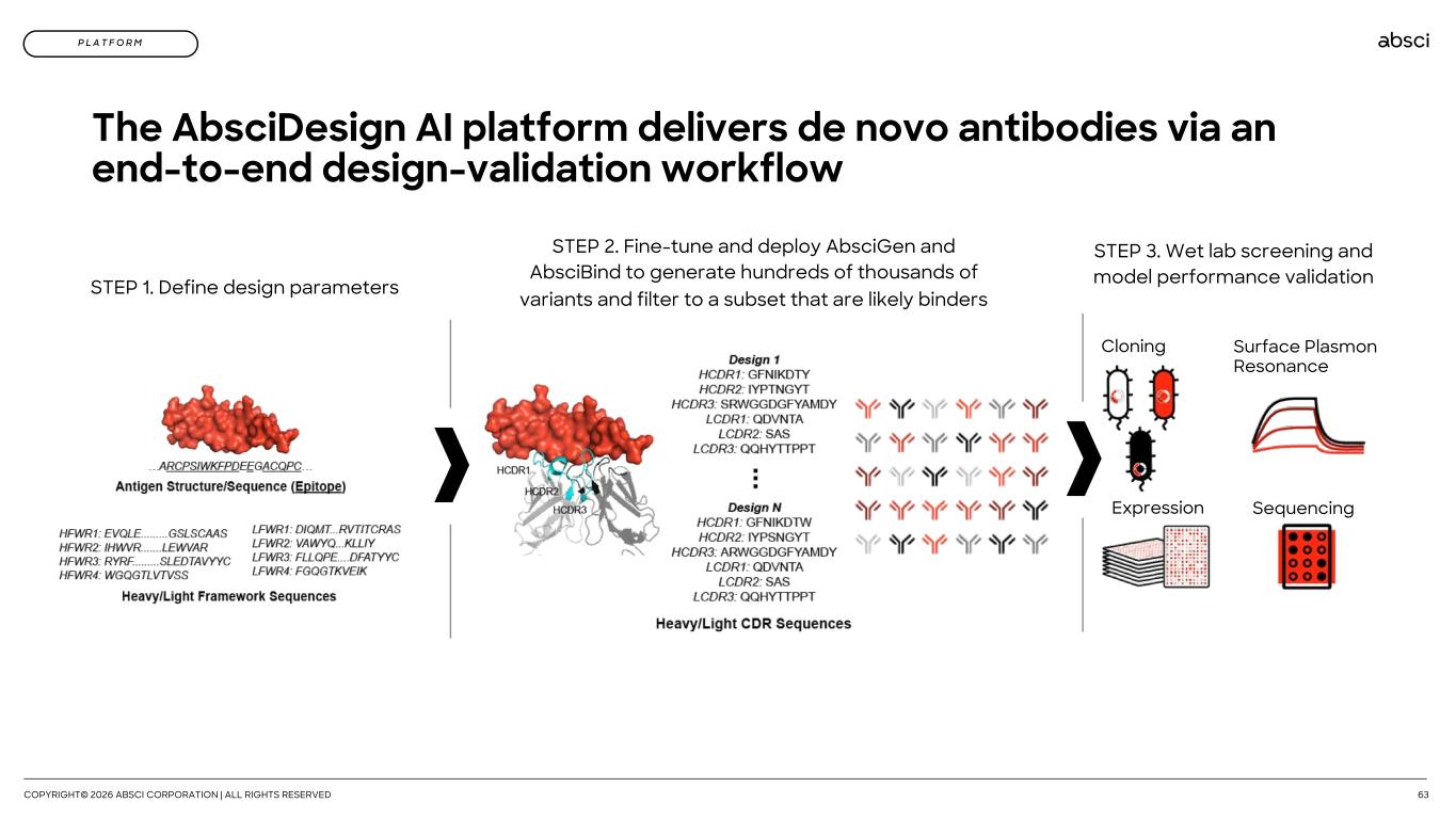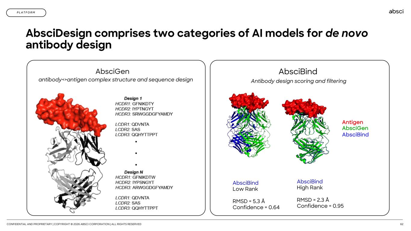 CONFIDENTIAL AND PROPRIETARY | COPYRIGHT © 2026 ABSCI CORPORATION | ALL RIGHTS RESERVED 62 P L A T F O R M AbsciDesign comprises two categories of AI models for de novo antibody design AbsciBindAbsciGen antibody<>antigen complex structure and sequence design Antibody design scoring and filtering Antigen AbsciGen AbsciBind AbsciBind High Rank RMSD = 2.3 Å Confidence = 0.95 AbsciBind Low Rank RMSD = 5.3 Å Confidence = 0.64