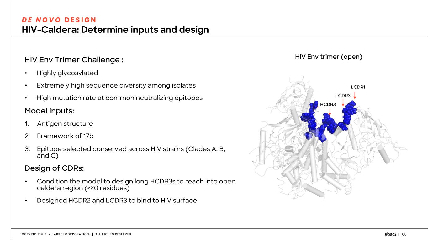 65C O P Y R I G H T © 2 0 2 5 A B S C I C O R P O R A T I O N . A L L R I G H T S R E S E R V E D . No natural or synthetic antibody for HIV exists today because immune system cannot derive an antibody that is universally neutralizing against HIV Design challenge: create universally neutralizing HIV antibody by binding unique and conserved epitope within “caldera” of open conformation of gp120 to prevent HIV from entering host cells Numerous attempts to target this epitope have failed-previous efforts have identified antibodies, but none bind the “caldera” and none are universally neutralizing. de novo design antibody that binds to the highly conserved caldera region of HIV gp120 D E N O V O D E S I G N 17b epitope Caldera HIV gp120 trimer (open)