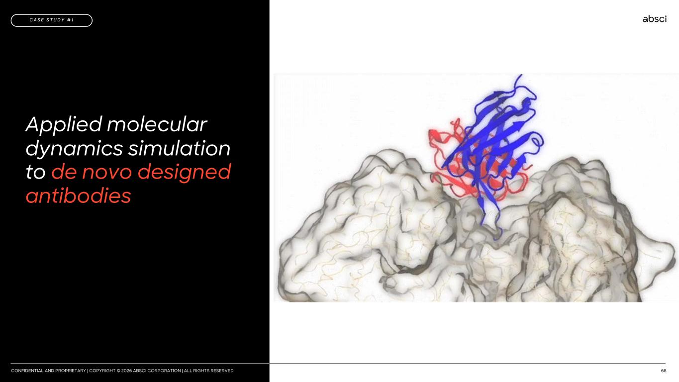 CONFIDENTIAL AND PROPRIETARY | COPYRIGHT © 2026 ABSCI CORPORATION | ALL RIGHTS RESERVED 68 2024 20252024 2025 2026 Applied molecular dynamics simulation to de novo designed antibodies C A S E S T U D Y # 1