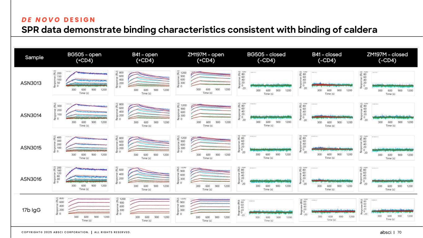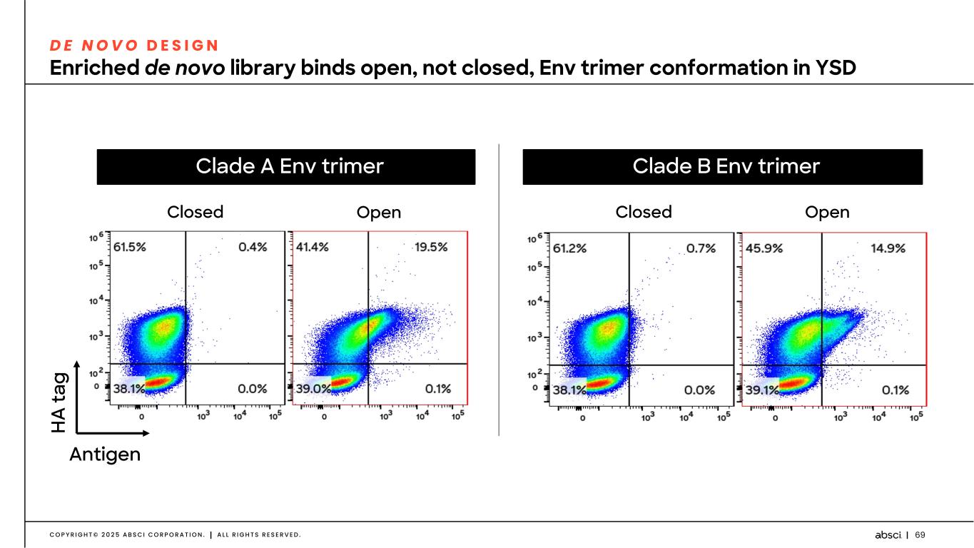 69C O P Y R I G H T © 2 0 2 5 A B S C I C O R P O R A T I O N . A L L R I G H T S R E S E R V E D . H A ta g Antigen Clade A Env trimer Closed Open Enriched de novo library binds open, not closed, Env trimer conformation in YSD D E N O V O D E S I G N Closed Open Clade B Env trimer