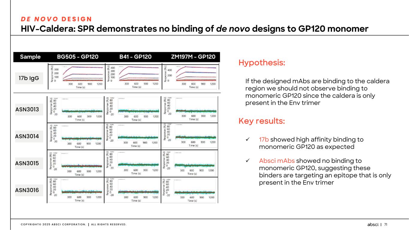 71C O P Y R I G H T © 2 0 2 5 A B S C I C O R P O R A T I O N . A L L R I G H T S R E S E R V E D . HIV-Caldera: SPR demonstrates no binding of de novo designs to GP120 monomer D E N O V O D E S I G N Hypothesis: If the designed mAbs are binding to the caldera region we should not observe binding to monomeric GP120 since the caldera is only present in the Env trimer Key results: ü 17b showed high affinity binding to monomeric GP120 as expected ü Absci mAbs showed no binding to monomeric GP120, suggesting these binders are targeting an epitope that is only present in the Env trimer ASN3013 ASN3014 ASN3015 ASN3016 17b IgG