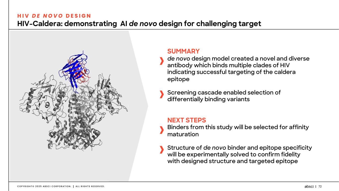 72C O P Y R I G H T © 2 0 2 5 A B S C I C O R P O R A T I O N . A L L R I G H T S R E S E R V E D . HIV-Caldera: demonstrating AI de novo design for challenging target H I V D E N O V O D E S I G N SUMMARY de novo design model created a novel and diverse antibody which binds multiple clades of HIV indicating successful targeting of the caldera epitope Screening cascade enabled selection of differentially binding variants NEXT STEPS Binders from this study will be selected for affinity maturation Structure of de novo binder and epitope specificity will be experimentally solved to confirm fidelity with designed structure and targeted epitope