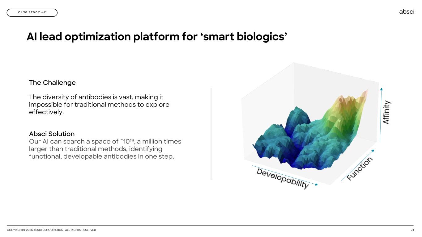 AI lead optimization platform for ‘smart biologics’ COPYRIGHT© 2026 ABSCI CORPORATION | ALL RIGHTS RESERVED 74 C A S E S T U D Y # 2 The Challenge The diversity of antibodies is vast, making it impossible for traditional methods to explore effectively. Absci Solution Our AI can search a space of ~1019, a million times larger than traditional methods, identifying functional, developable antibodies in one step.
