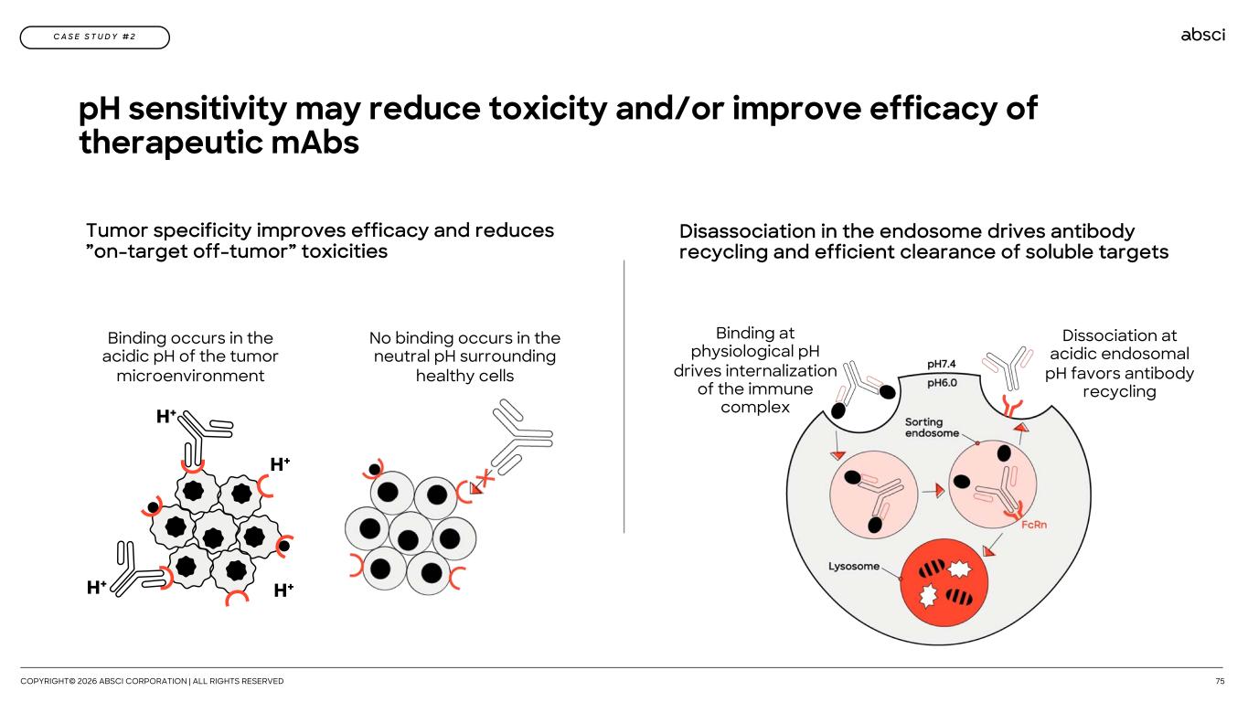 pH sensitivity may reduce toxicity and/or improve efficacy of therapeutic mAbs COPYRIGHT© 2026 ABSCI CORPORATION | ALL RIGHTS RESERVED 75 C A S E S T U D Y # 2 Tumor specificity improves efficacy and reduces ”on-target off-tumor” toxicities Binding occurs in the acidic pH of the tumor microenvironment No binding occurs in the neutral pH surrounding healthy cells Disassociation in the endosome drives antibody recycling and efficient clearance of soluble targets Dissociation at acidic endosomal pH favors antibody recycling Binding at physiological pH drives internalization of the immune complex
