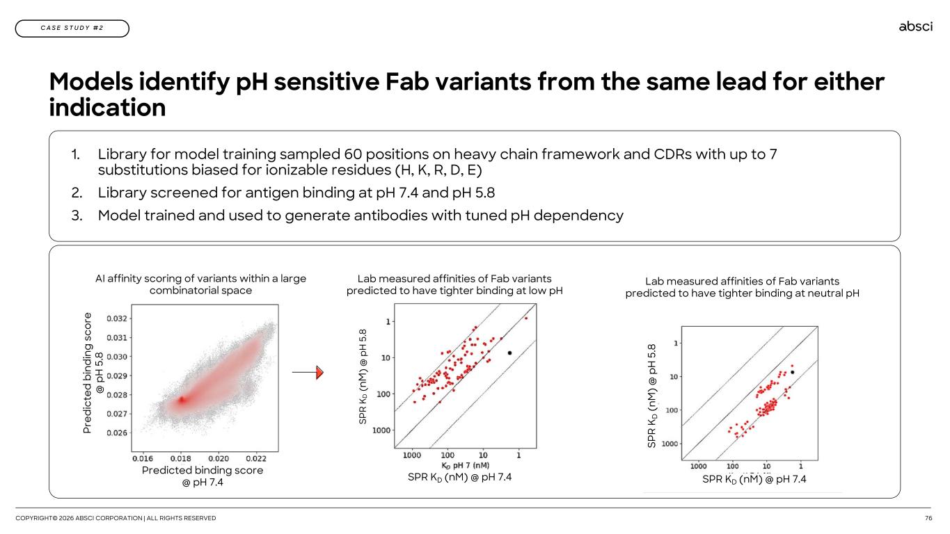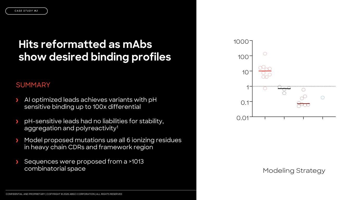 CONFIDENTIAL AND PROPRIETARY | COPYRIGHT © 2026 ABSCI CORPORATION | ALL RIGHTS RESERVED 2024 20252024 2025 2026 Hits reformatted as mAbs show desired binding profiles SUMMARY AI optimized leads achieves variants with pH sensitive binding up to 100x differential pH-sensitive leads had no liabilities for stability, aggregation and polyreactivity1 Model proposed mutations use all 6 ionizing residues in heavy chain CDRs and framework region Sequences were proposed from a >1013 combinatorial space pH 5.8 not p H 7.4 bind at b oth pH 7.4 not p H 5.8 Pare nta l 0.01 0.1 1 10 100 1000 Modeling Strategy SP R KD 7 .4 / 5. 8 SOURCE: 1 Data provided in appendix C A S E S T U D Y # 2